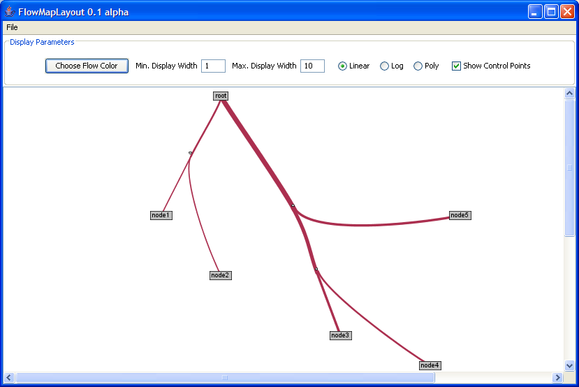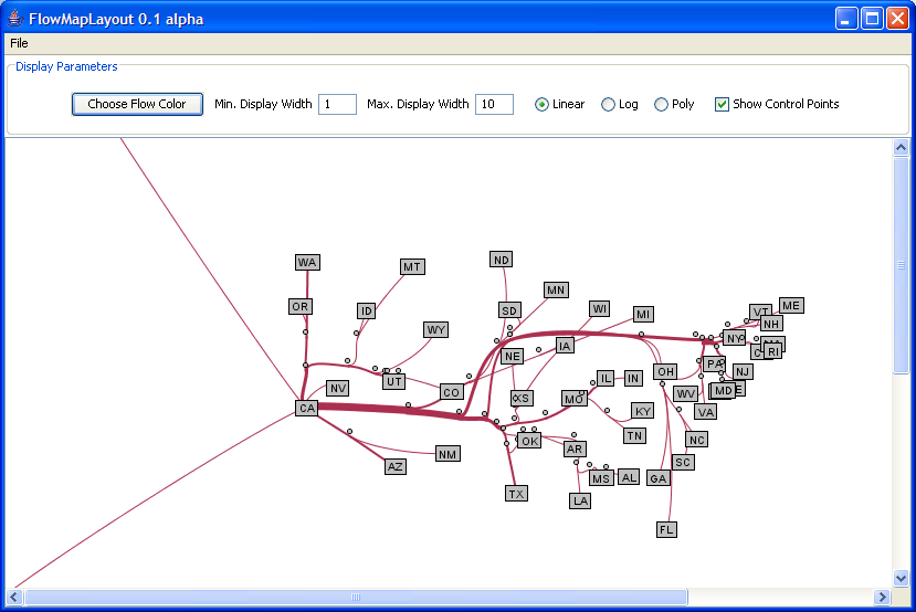 To run the code, download the zip file: flowmap.0.1.alpha.zip. You should also download and install Java 5 or higher, either the JDK or the JRE. Unzip all the files into a directory. All the files should reside in the same directory. There should be several files: epsgraphics.jar, j3dcore.jar, prefuse.jar, prefusex.jar, and vecmath.jar
