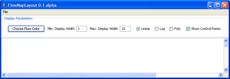 The File menu allows you to open a .csv file (two of which are provided in the .zip), which opens a .csv file and renders the map. You also can save the current visible image of the flow map to .jpg or .eps.