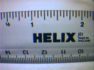 Second, on the bottom of the ruler, we get color aliasing due to the spacing of the R, G, and B sensors on the camera's CCD array. This may be difficult to fix in software. We can compensate for this by putting the camera slightly out of focus, or by moving the object closer until the features appear large enough that they don't alias (Like the word "HELIX").