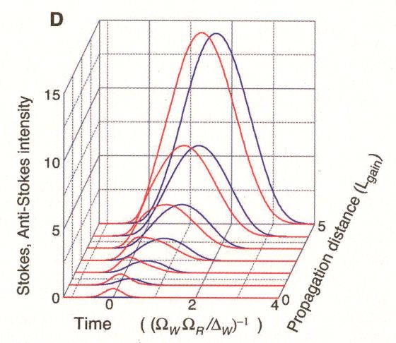 StoryThe paper examines a method for producing of a pair of quantum-mechanically correlated light pulses separated by a controllable delay. The emission of the Stokes photon is accompanied by a change in the spin-wave of an ensemble of rubidium atoms. The application of a second control beam (the retrieve beam) triggers the conversion of this spin state into a second light beam (the anti-Stokes) correlated with the first. The figure plots a theoretical simulation of an initial Stokes fluctuation propagating and evolving into an amplified pair of Stokes (red) and anti-Stokes (blue) light pulses with locked propagation.