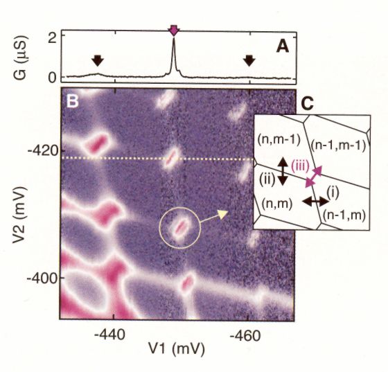 More Detail >>This diagram examines the differential conductance from source to drain as a function of the voltages at the two coupling electrodes. Each hexagonal cell represents a charge configuration with n electrons on dot 1 and m electrons on dot 2. A major effect the graph is intended to illustrate is the pronounced resonance produced by the exchange of two electrons in the coupling between configurations (n,m) and (n-1,m-1).
