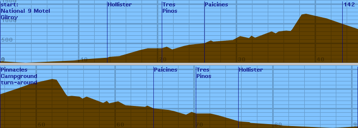 Dist Grade Alti. Location ---- ----- ------ -------- 0.00 0% 240 4:09am, AVS 17.9, Nat'l 9 Inn, (760' sofar) -MMPE- 3.19 0% 200 L on HWY 25 towards hollister 9.4 0% 260 on HWY 25 - begin construction 10.6 0% 290 end construction 13.6 0% 330 Downtown hollister, AVS 17.4 13.8 0% 350 5:13am, 7-11 stop 15.1 0% 370 5:20am, Burger King in south Hollister (5:40) 17.65 0% 520 last stopsign outside hollister 18.7 0% 570 Best road 20.5 0% 570 Entering Tres Pinos 6:05am 21.1 0% 610 leaving Tres Pinos 21.8 0% 540 bottom of hill 23.3 0% 630 cresting 24.0 0% 660 another rise top 25.9 0% 700 6:33am, Paicines minimart 6:30am-6:30pm weekdays, S/S 8:30am-6:30pm, (6:50am) 26.7 0% 770 crest 27.0 0% 740 low point 29.48 0% 780 approaching hill 30.4 0% 880 cresting 31.53 0% 830 starting another hill 31.83 0% 890 cresting 32.3 0% 840 low point 34.4 0% 1000 7:31am 34.91 0% 950 low point - bridge over San Benito River 35.31 0% 1000 36.25 0% 1020 36.8 0% 1010 begin big climb 36.99 0% 1050 7:50am (stop to take off layer of clothes) (7:56) 38.2 0% 1430 top of climb 38.75 0% 1450 begin descent 41.4 0% 1330 43.4 0% 1190 turn R on entrance to pinnacles 8:27, 2400' sofar 45.36 0% 1060 turn around, gravel wipeout, 2400' sofar, AVS 15.7 8:37 - store hours: M-F 4pm-5pm, S-S 9am-5pm 47.32 0 1190 49.32 0 1330 51.97 0 1450 52.52 0 1430 53.73 0 1050 53.92 0 1010 54.47 0 1020 55.41 0 1000 55.81 0 950 56.32 0 1000 58.42 0 840 58.89 0 890 59.19 0 830 60.32 0 880 61.24 0 780 63.72 0 740 64.02 0 770 64.82 0 700 66.72 0 660 67.42 0 630 68.92 0 540 69.62 0 610 70.22 0 570 72.02 0 570 73.07 0 520 75.62 0 370 76.92 0 350 77.12 0 330 80.12 0 290 81.32 0 260 87.53 0 201 90.72 0 240