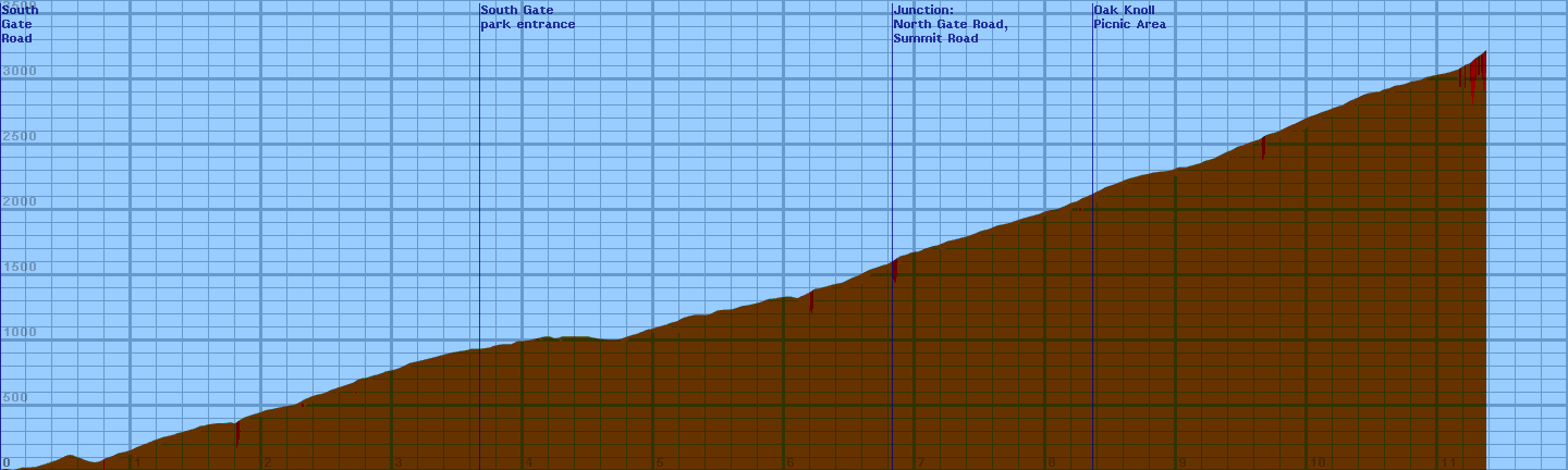 Dist Grade Alti. Location ---- ----- ------ -------- 0.00 4% 590 start - South Gate Road at Athenian School, 0.11 mi from Diablo Road 0.02 0% 600 0.06 -6% 600 0.09 0% 590 0.13 4% 600 0.16 0% 610 0.21 3% 610 0.27 4% 615 0.32 6% 630 0.38 8% 650 0.44 6% 670 Diablo Ranch Estates (being built) 0.48 7% 690 0.51 7% 705 0.54 0% 710 0.56 -8% 700 0.59 -7% 690 0.62 -10% 680 rough road 0.64 -6% 670 0.67 -6% 660 0.71 0% 650 0.73 6% 650 0.77 6% 660 0.80 5% 680 end of potholes 0.83 7% 690 0.86 16% 700 sharp right turn 0.87 8% 705 0.90 6% 720 0.95 6% 730 0.97 9% 735 sweeping right turn 1.01 6% 750 1.05 7% 770 signs: emergency parking only, no scooters or skateboards 1.08 8% 780 sign: speed limit 20, radar enforced 1.10 3% 790 1.13 15% 800 right turn, sign: fire danger today: XXX 1.14 8% 805 1.16 6% 810 sign: speed checked by radar 1.17 3% 820 sign: no alcoholic beverages permitted in park 1.20 7% 825 sign: (curvy) next 6 miles 1.23 5% 840 1.32 6% 860 1.36 12% 875 middle of S-curve 1.38 6% 880 1.49 6% 910 1.53 4% 930 1.55 0% 930 1.59 2% 940 1.66 3% 950 1.70 7% 950 1.73 2% 950 sign: emergency parking only next 2.5 miles 1.77 1% 960 1.79 11% 940 right turn 1.81 8% 960 1.84 8% 980 1.88 5% 1000 1.98 7% 1030 2.03 7% 1050 2.09 4% 1060 2.13 6% 1070 2.18 4% 1080 2.24 6% 1090 2.27 8% 1100 2.31 15% 1120 sharp right 2.32 7% 1130 2.37 7% 1150 2.39 6% 1160 2.48 6% 1180 2.52 12% 1200 right turn 2.54 5% 1210 2.57 14% 1215 right turn 2.58 3% 1225 2.61 7% 1230 2.70 6% 1260 2.73 10% 1280 approaching left turn 2.75 4% 1290 2.81 5% 1300 2.85 6% 1315 2.88 8% 1320 2.91 5% 1330 2.96 4% 1350 3.02 6% 1360 3.07 7% 1380 3.13 7% 1410 3.22 7% 1430 3.26 6% 1440 3.32 5% 1455 3.41 4% 1480 3.45 2% 1490 3.51 2% 1500 3.57 4% 1510 3.58 11% 1510 right turn 3.60 1% 1520 3.67 2% 1520 South Gate (kiosk, employee residence, stop sign) 3.75 6% 1530 3.78 2% 1545 3.84 2% 1555 3.91 3% 1555 3.96 4% 1580 4.00 0% 1580 4.05 4% 1585 4.10 4% 1600 4.12 7% 1600 zig to the right 4.14 3% 1610 4.19 0% 1615 right side: vertical rock with hollows, carvings 4.21 -14% 1615 short drop 4.23 -2% 1600 40-foot granite face on right 4.26 -1% 1600 4.30 3% 1615 4.34 0% 1615 4.43 0% 1615 4.49 0% 1615 lower Rock City Picnic Area 4.56 -2% 1600 4.65 -1% 1590 4.68 0% 1590 4.72 7% 1590 4.76 6% 1600 4.80 3% 1615 4.87 8% 1635 4.91 5% 1650 4.96 5% 1670 4.98 1% 1670 5.02 4% 1685 5.08 6% 1700 5.11 12% 1710 right turn 5.13 6% 1720 5.18 4% 1730 5.20 15% 1745 right turn 5.22 3% 1755 5.25 3% 1765 5.31 0% 1780 parking lot on right - mtn bikers 5.37 0% 1780 5.41 4% 1780 5.44 6% 1790 5.49 3% 1815 5.57 2% 1820 5.61 5% 1825 entering pine grove 5.68 6% 1850 5.70 2% 1850 5.77 4% 1865 5.83 7% 1880 5.87 7% 1900 5.92 1% 1905 6.01 2% 1920 6.04 -1% 1920 6.07 -4% 1915 6.10 0% 1905 6.12 7% 1920 sign: elevation 2000 feet 6.15 8% 1930 6.19 8% 1950 6.23 7% 1980 6.26 3% 1980 6.29 5% 1990 6.33 7% 2000 entrance to Wildcat Group Camp 6.38 5% 2015 sign: speed limit 15 6.44 7% 2025 6.51 4% 2060 6.57 8% 2085 6.59 7% 2095 sign: one-lane road 6.61 9% 2105 stop sign: left lane ahead collapsed 6.64 5% 2120 end of one-lane road 6.66 7% 2130 6.70 4% 2140 6.75 7% 2160 6.78 7% 2165 6.83 9% 2190 junction with North Gate Road -- begin Summit Road 6.84 9% 2200 6.87 10% 2220 right turn 6.89 5% 2230 entering grove 6.93 6% 2240 6.98 4% 2260 7.03 8% 2265 picnic ground on right -- under oak shade 7.07 4% 2285 7.13 4% 2305 speed limit 20 -- radar enforced 7.18 6% 2315 7.25 6% 2345 mile post 7.1 7.30 5% 2355 7.41 5% 2385 7.44 5% 2395 lookout point picnic area 7.51 5% 2425 7.56 7% 2435 7.63 6% 2465 7.71 6% 2480 7.77 5% 2500 7.83 6% 2520 7.94 5% 2550 8.02 6% 2580 8.09 6% 2590 8.16 6% 2620 8.20 9% 2640 8.23 9% 2645 8.25 11% 2655 8.28 9% 2675 8.31 8% 2685 8.33 8% 2695 8.36 5% 2705 oak knoll picnic area 8.39 8% 2725 8.42 8% 2735 8.45 7% 2755 8.51 7% 2775 8.54 5% 2785 8.56 13% 2795 right turn 8.58 9% 2800 8.61 9% 2815 8.64 7% 2825 8.70 8% 2840 8.73 4% 2850 8.79 1% 2860 8.82 4% 2870 8.91 5% 2880 8.97 2% 2890 8.99 7% 2900 9.01 2% 2910 9.07 6% 2910 9.14 4% 2930 sign: speed limit 15 9.18 6% 2940 big paved parking lot on the left - westerly view 9.22 8% 2960 9.28 7% 2975 9.33 6% 3000 9.37 9% 3020 9.39 8% 3030 mile post 9.25 9.43 6% 3045 9.47 8% 3070 9.52 12% 3080 right turn 9.53 6% 3090 9.59 7% 3110 9.64 8% 3125 9.68 9% 3155 9.71 8% 3165 9.75 7% 3175 9.80 6% 3195 9.86 9% 3225 9.91 6% 3245 9.95 7% 3265 10.01 7% 3295 10.07 7% 3315 10.12 7% 3335 10.18 6% 3355 10.20 10% 3365 10.23 5% 3375 10.27 7% 3385 10.32 7% 3415 10.39 7% 3445 10.43 8% 3465 10.46 3% 3475 10.51 5% 3485 10.56 7% 3490 10.58 4% 3505 10.63 7% 3515 10.67 3% 3535 10.74 3% 3545 10.78 9% 3560 10.80 4% 3570 10.82 5% 3570 crosswalk 10.87 7% 3580 10.91 5% 3600 11.00 6% 3620 11.06 4% 3630 sign: detour ahead 11.16 4% 3660 day-use parking entrance to the right 11.18 8% 3680 11.20 10% 3680 11.21 6% 3700 road splits 11.23 10% 3700 11.24 14% 3700 11.25 16% 3710 11.26 16% 3720 11.28 15% 3740 11.29 15% 3750 11.30 15% 3750 11.32 16% 3770 11.33 15% 3770 11.34 15% 3780 11.35 14% 3790 11.36 13% 3800 sign: summit elevation 3849 11.37 9% 3810 entering 20-min parking lot at the summit
