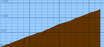 According to my measurements, the road is 3.37 miles long (from the bridge to the stop sign), and gains 1290 feet. Due to its twisting nature and constantly changing grades, the local gradiometer readings should be considered approximate. Even though I measured the grade every 30-50 yards, I still did not capture all the bumps and undulations in the climb. I did a lot of guesswork to try to pick a sample that was representative of each segment.