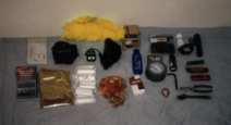 maps, headlight, 2 battery packs, windbreaker, 2 spare tubes, mini