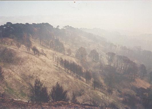 A view from Tunnel Road shows a whole hillside charred barren by the