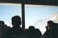 ++ Here's the view from the first station, just slightly above cloud level. Notice the snow piling up against the window on the right and bottom. The window is just flush with the face of the mountain. |