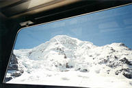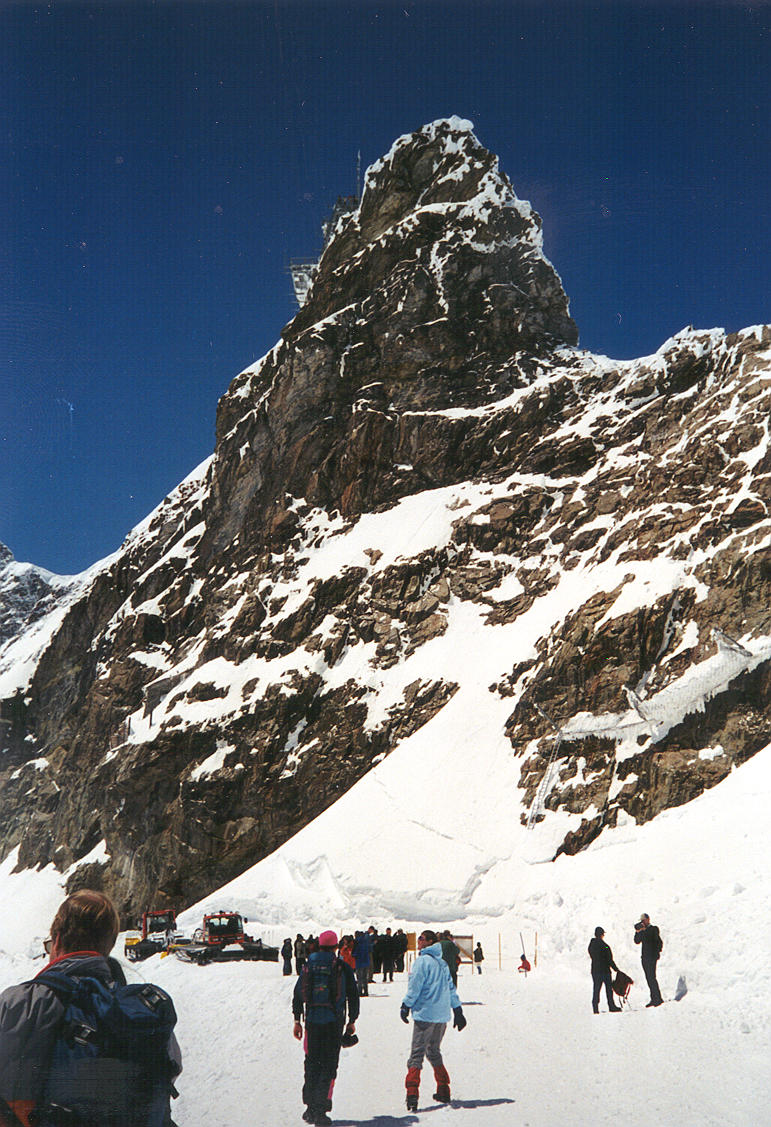 ++ Jungfraujoch station. Here we are standing outside on the glacier, at train station level. The observation deck sits high atop this rock spire. You can see part of it on the left. An elevator climbs up from the station to the observatory in a mere 25 seconds, reaching speeds of 15 mph. |