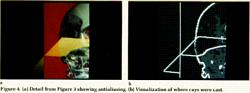 Figure 4. (a) Detail from Figure 3 showing antialiasing. (b) Visualization of where rays were cast. |