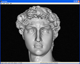 Demonstrating recent improvements in digitizing the shape of physical objects, a team of 30 faculty, staff, and students from Stanford University and the University of Washington spent the 199899 academic year digitizing the sculptures and architecture of Michelangelo, including the well-known sculpture of David. Our main scanning device was a laser triangulation rangefinder mounted on a motorized gantry (a), using it to digitize the marble statues with a spatial resolution of 0.25mm, dense enough to capture Michelangelo's chisel marks. After scanning, our range data-processing pipeline aligned the scans taken from different gantry positions, combined them into a unified surface mesh, and automatically filled any small holes that could not be seen by the scanner [2]. Scanning the David took three weeks, with 400 individually aimed scans resulting in two billion polygons of data. Reduced-resolution versions of the resulting 3D model have been used to make computer renderings (b) and for a variety of scientific and scholarly studies.