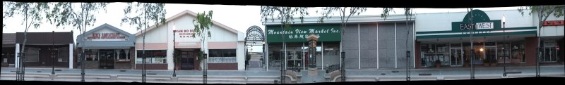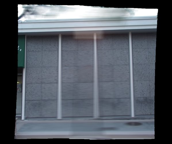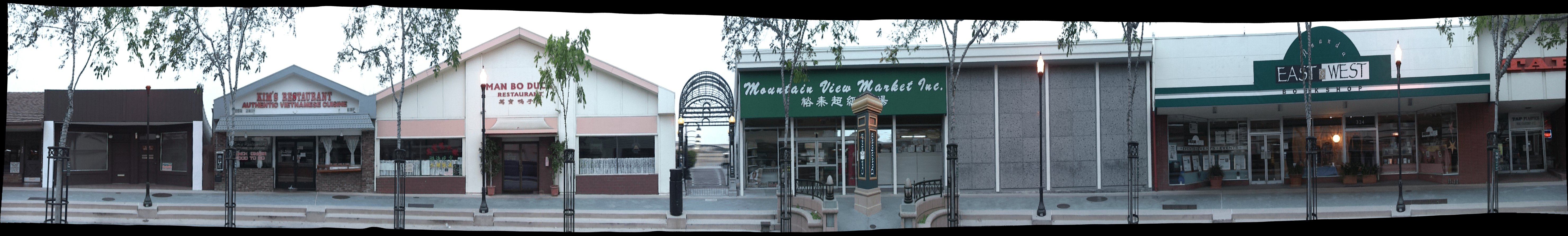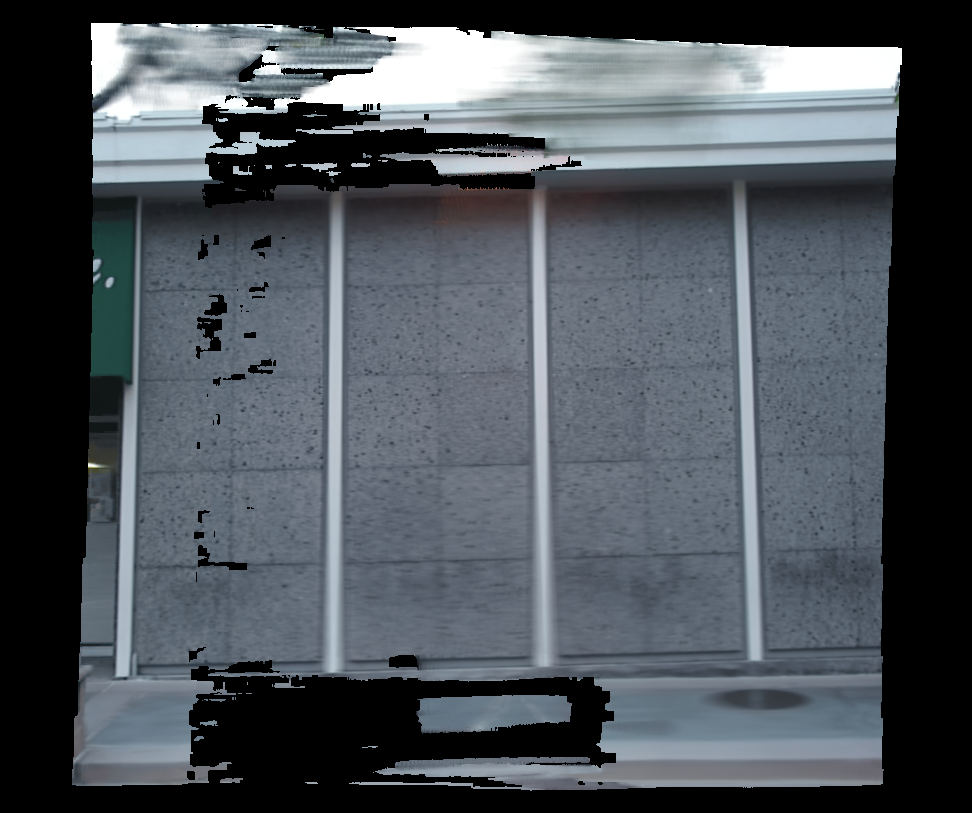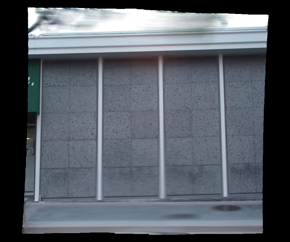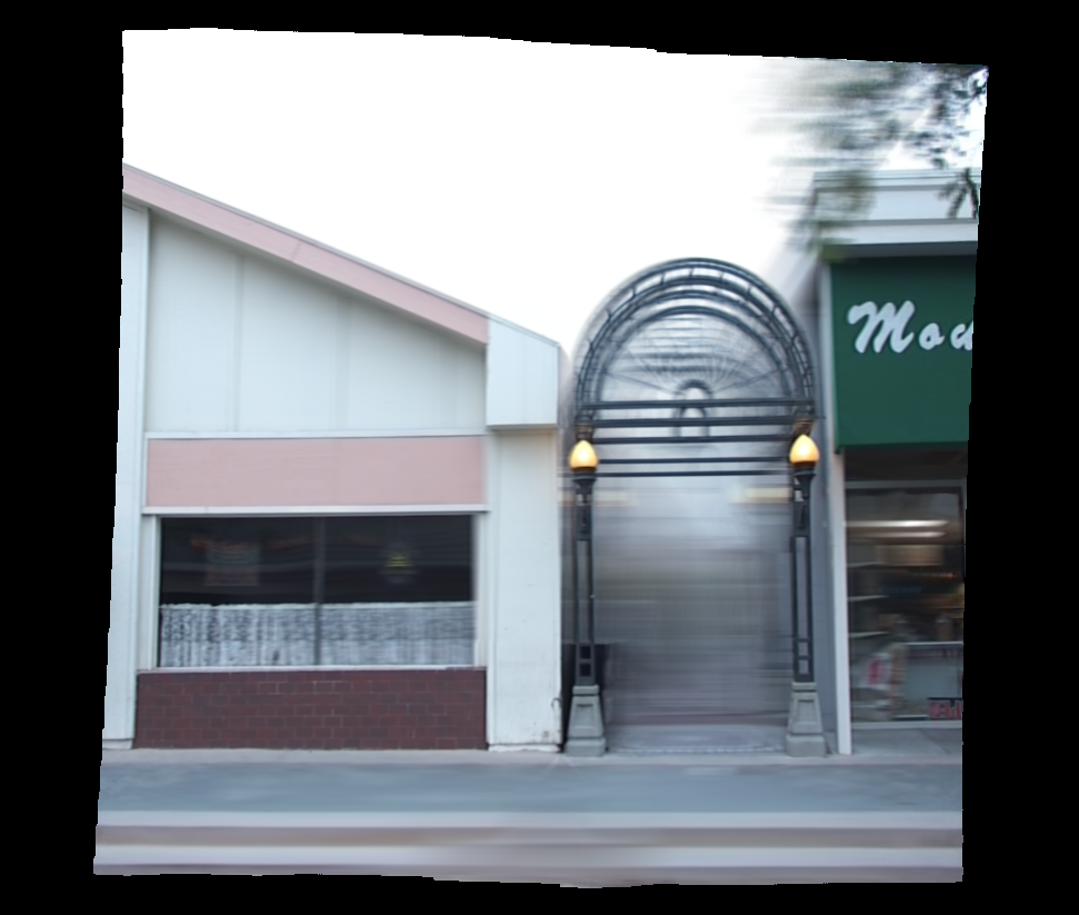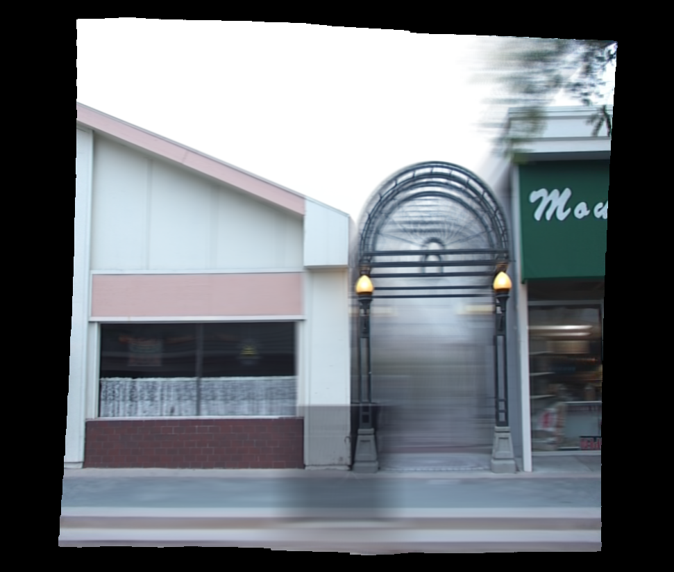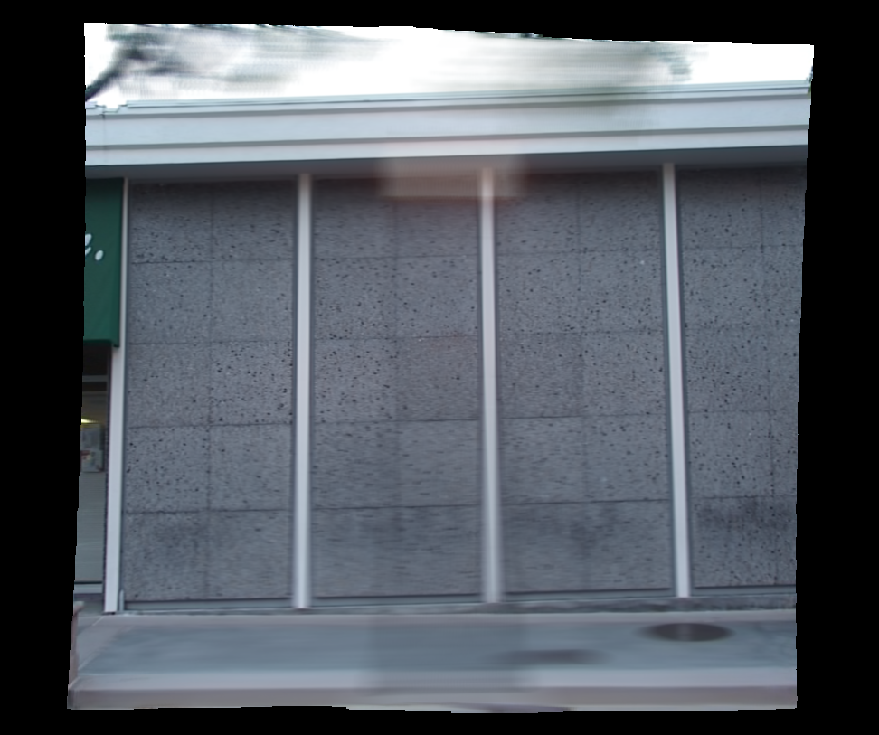 We also created multi-perspective panorama from the video sequence with the light pole and waste bin removed. If constructed naively, the new panoramas would have holes in place of light pole and the waste bin. To fill in the holes we simply copied the strips with holes from the nearest video frame which did not have hole at that location. Since, we have a very dense video data set and the panorama was created with image plane set at store facade, this assumption is mostly valid. It generates small artifacts but they are unnoticeable unless there are significant depth differences. This technique can be directly extended to remove people from the panoramas. This is because people are just about the size of the waste bin and it is removed completely. Unfortunately, we did not have a good data set with people to try on, but the idea should work. Figure 7 illustrates this appropriately. Note that both the pole and the bin are removed completely. We don't see any artifact on the facade because that is our assumed depth, though we see some artifacts in the alley way because of significant depth difference.