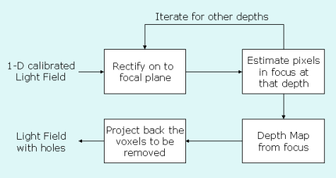 | Figure 2: The figure shows the pipeline for foreground object removal from dense video data. The input to the pipeline is assumed to be a calibrated 1-D light field and the output is a light field with specified object removed from it. |