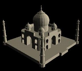 These pictures show a single source image of the Taj Mahal, and the 3D model generated by Debevec's program, facade. Basic geometric primitives (i.e. "blocks") are good for modeling many of the features found in architecture, such as flat walls and objects of revolution. They often have identifiable edges that enable easy correspondences between the picture and the model. Currently, facade is able to handle polygonal walls, surfaces of revolution, and archways.