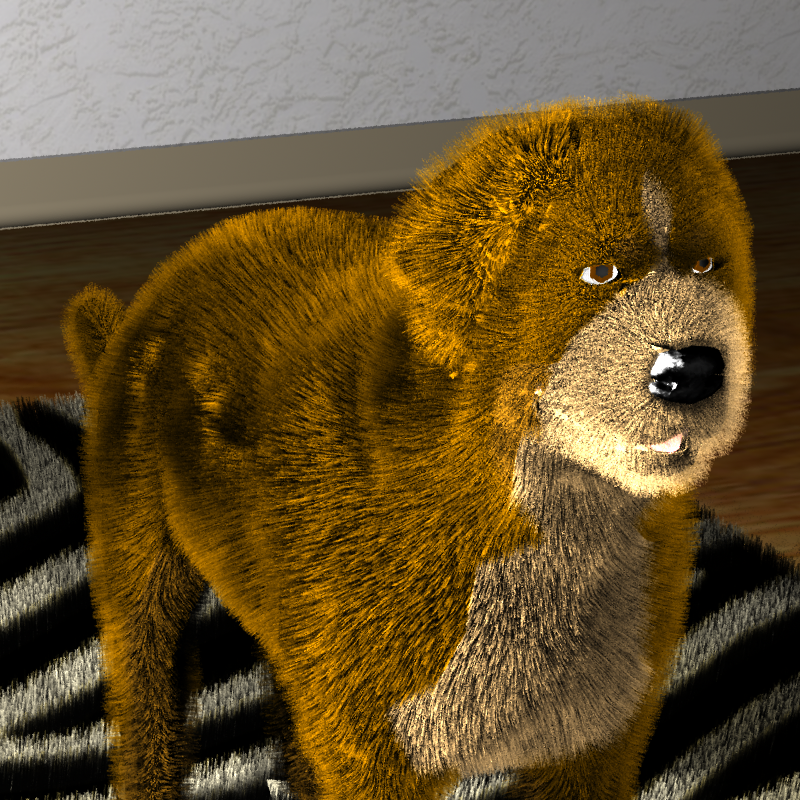 The maxdepth parameter specifies the maximum number of times rays will bounces off of specular surfaces (as in the Whitted integrator), and samplesegmentlength controls the length of the sample segments used in calculating light scattering and transmittance through fur volumes. The values above are typical values we used while rendering our scenes.