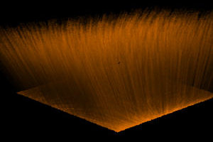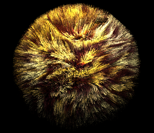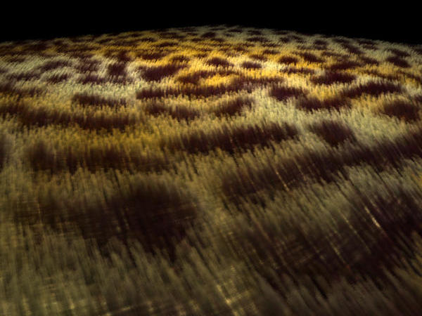 Here, in lieu of a real leopard, we have generated a sphere covered in leopard fur! Two coats of fur were used in this image. Note the awesome effect the lighting has on the bright and dark portions of the sphere. We see in this image that the fur has a porcupine-like, unrealistic spiky quality. This will be addressed in the next image...