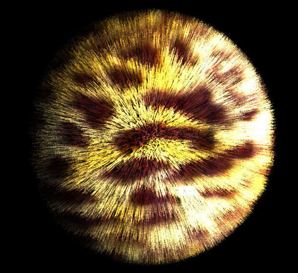 Now, a sphere covered in "messy" leopard fur! Note how organic and life-like the fur has suddenly become, just through random perturbations in the surface normals.