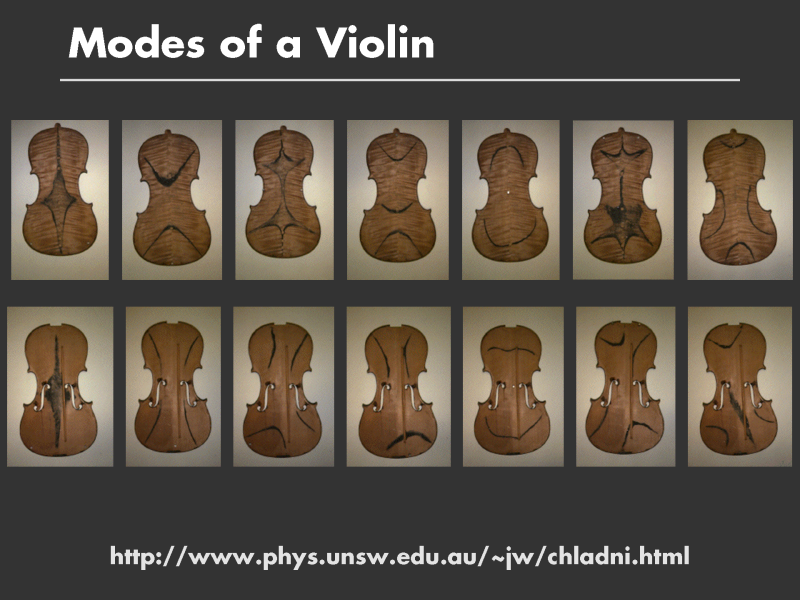 Here is a more interesting example of a Chladni pattern which Chladni would have appreciated. Some violin makers use Chladni diagrams as they make a violin. This set of images shows the vibration modes of a violin. Each picture represents a different frequency, increasing from left to right, top to bottom. Note the unusual criss-crossing patterns at higher frequencies.