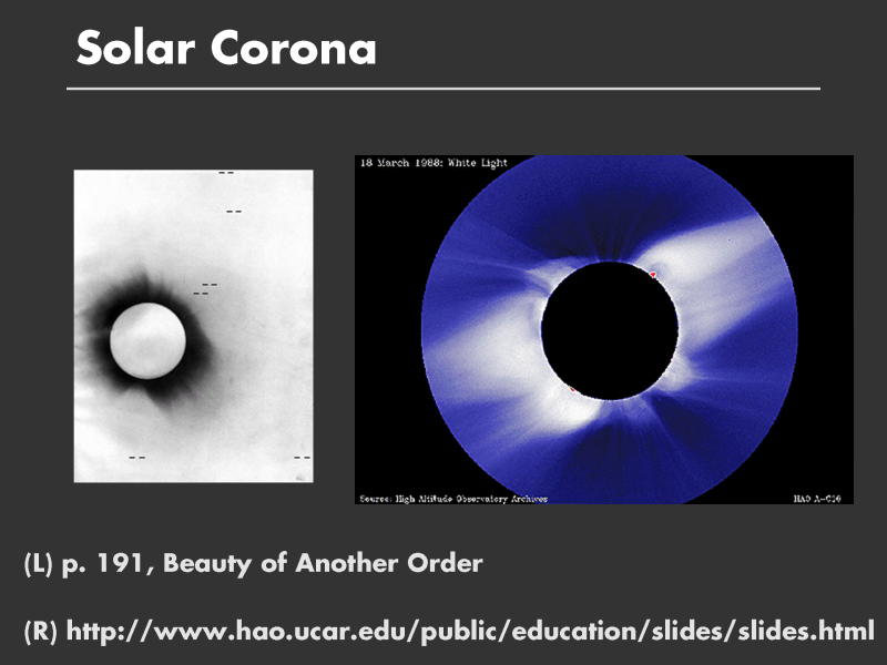 This idea of forming a difference image is powerful. Under normal viewing conditions you can?t see the solar corona because the sun is so bright. Many early scientists realized that a good time to observe the properties of the sun was during a total eclipse. On the left is a picture taken during the eclipse of 1919; on the right is a picture taken in 1988 in the Philippines. These pictures show the wispy, looping tracks of particles in the corona under the influence of the sun?s magnetic field.