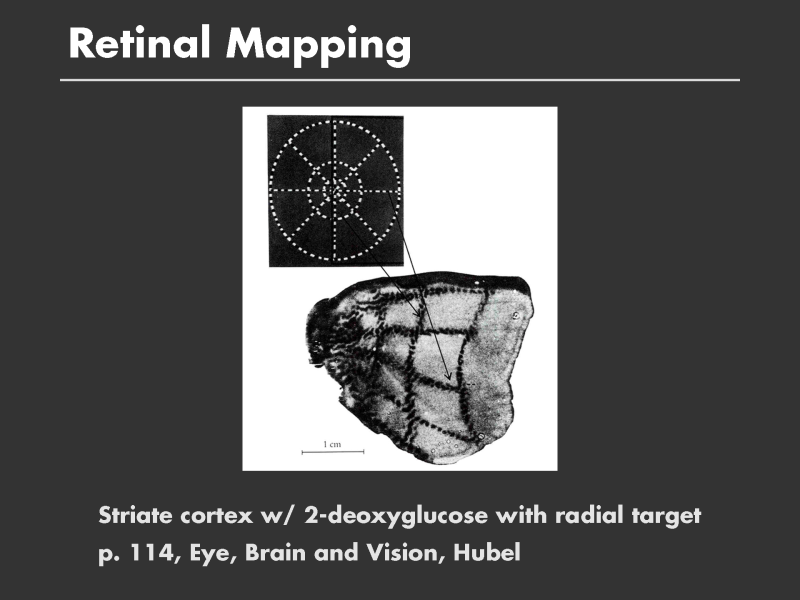 This self-illustrating phenomena shows the pattern in the brain when the monkey views a radial target with the only right eye open. This experiment showed that there is a direct mapping from visual field to the visual cortex, and that the transformation is logarithmic in r. That is, more space in the cortex is devoted to the foveal region of the retina than to the peripheral regions.