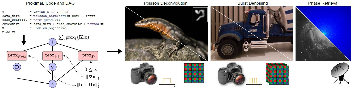 Computational photography systems are becoming increasingly diverse while computational resources, for example on mobile platforms, are rapidly increasing. As diverse as these camera systems may be, slightly different variants of the underlying image processing tasks, such as demosaicking, deconvolution, denoising, inpainting, image fusion, and alignment, are shared between all of these systems. Formal optimization methods have recently been demonstrated to achieve state-of-the-art quality for many of these applications. Unfortunately, different combinations of natural image priors and optimization algorithms may be optimal for different problems, and implementing and testing each combination is currently a time consuming and error prone process. ProxImaL is a domain-specific language and compiler for image optimization problems that makes it easy to experiment with different problem formulations and algorithm choices. The language uses proximal operators as the fundamental building blocks of a variety of linear and nonlinear image formation models and cost functions, advanced image priors, and different noise models. The compiler intelligently chooses the best way to translate a problem formulation and choice of optimization algorithm into an efficient solver implementation. In applications to the image processing pipeline, deconvolution in the presence of Poisson-distributed shot noise, and burst denoising, we show that a few lines of ProxImaL code can generate a highly-efficient solver that achieves state-of-the-art results. We also show applications to the nonlinear and nonconvex problem of phase retrieval.