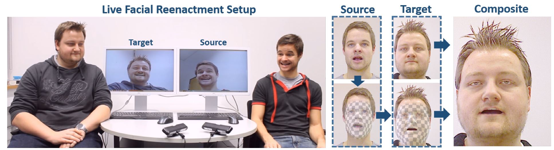 We present a method for the real-time transfer of facial expressions from an actor in a source video to an actor in a target video, thus enabling the ad-hoc control of the facial expressions of the target actor. The novelty of our approach lies in the transfer and photo-realistic re-rendering of facial deformations and detail into the target video in a way that the newly-synthesized expressions are virtually indistinguishable from a real video. To achieve this, we accurately capture the facial performances of the source and target subjects in real-time using a commodity RGB-D sensor. For each frame, we jointly fit a parametric model for identity, expression, and skin reflectance to the input color and depth data, and also reconstruct the scene lighting. For expression transfer, we compute the difference between the source and target expressions in parameter space, and modify the target parameters to match the source expressions. A major challenge is the convincing re-rendering of the synthesized target face into the corresponding video stream. This requires a careful consideration of the lighting and shading design, which both must correspond to the real-world environment. We demonstrate our method in a live setup, where we modify a video conference feed such that the facial expressions of a different person (e.g., translator) are matched in real-time.