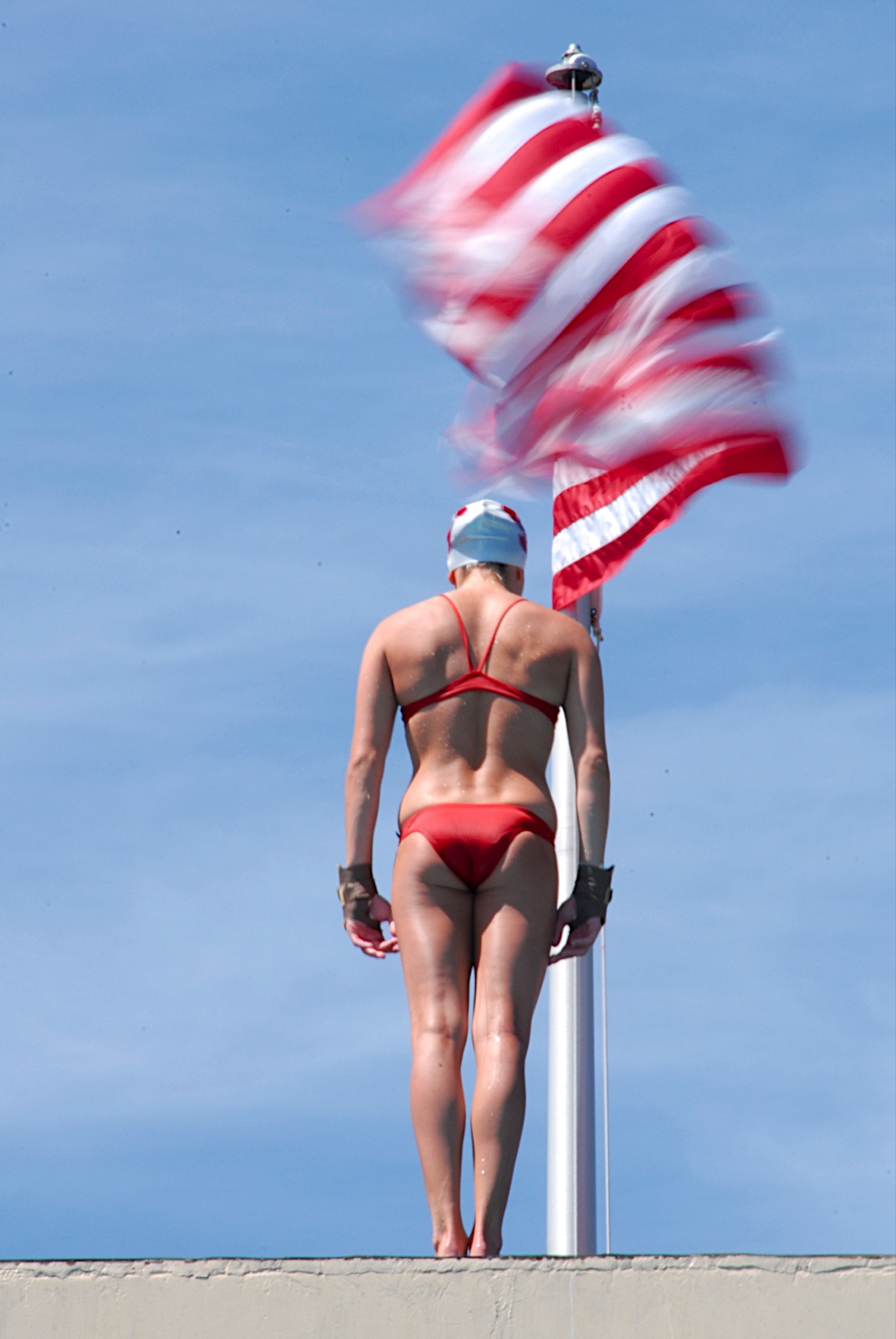 So, I wanted to take a picture of someone actually diving. But that was very tricky because they moved really quickly. When I saw this set-up though. I thought it would be great for the blur the action requirement. You can see that the flag is waving but the diver is in focus. I used shutter priority for this at 1/13 giving an aperture of f/36.0
