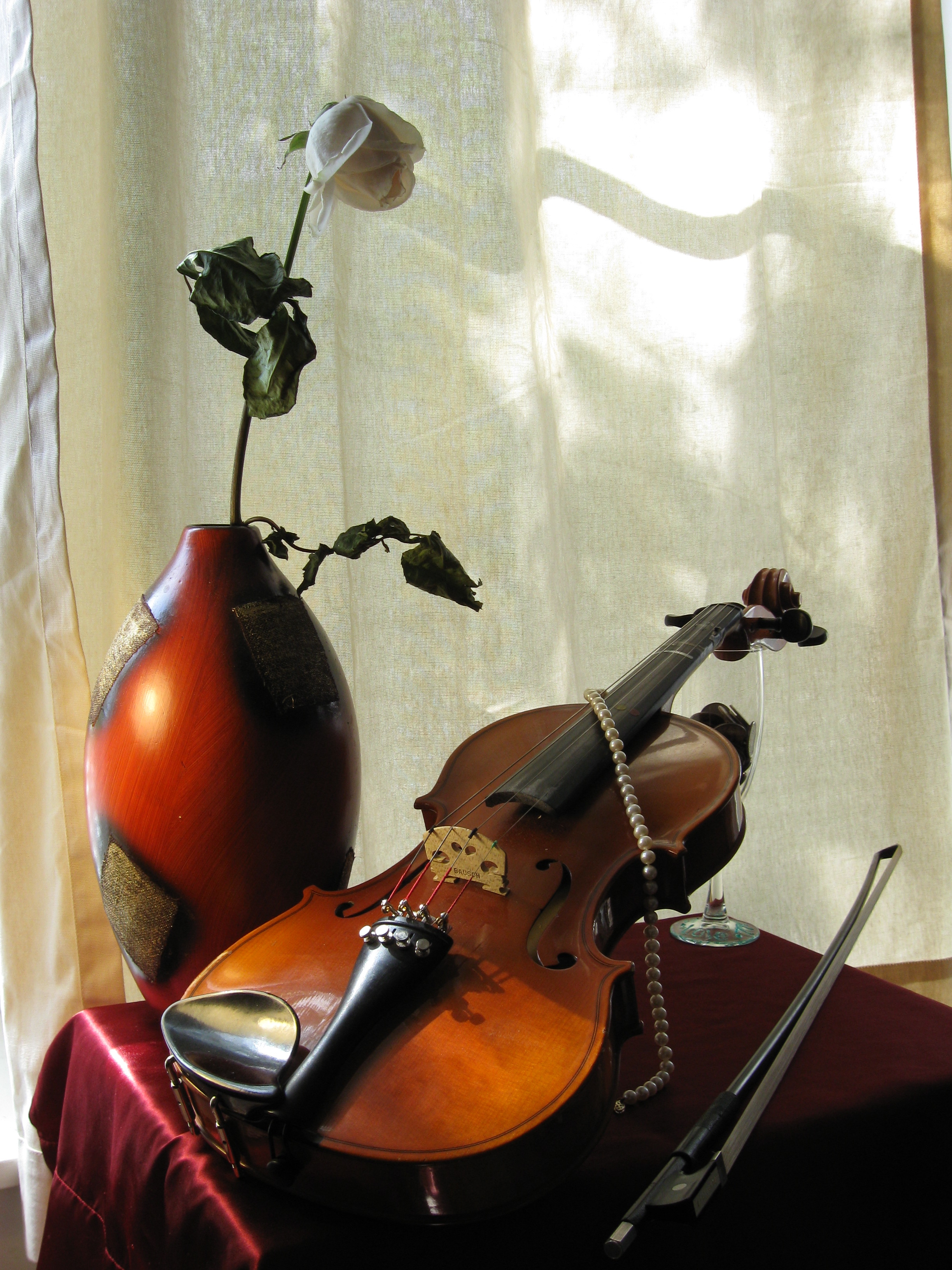 This photo satisfies requirements 1,2, and 4. The photo represents the theme of vanity with the classic symbols of a musical instrument (the violin), a rose (the white rose), jewelry (the pearl necklace), and money (the glass filled with coins). I vase was simply to add a roundedness, as well as I thought the tone of the wood fit well. Much thought went into the background and the lighting. I let a little of natural light through the blind onto the violin to let the varnish shine.