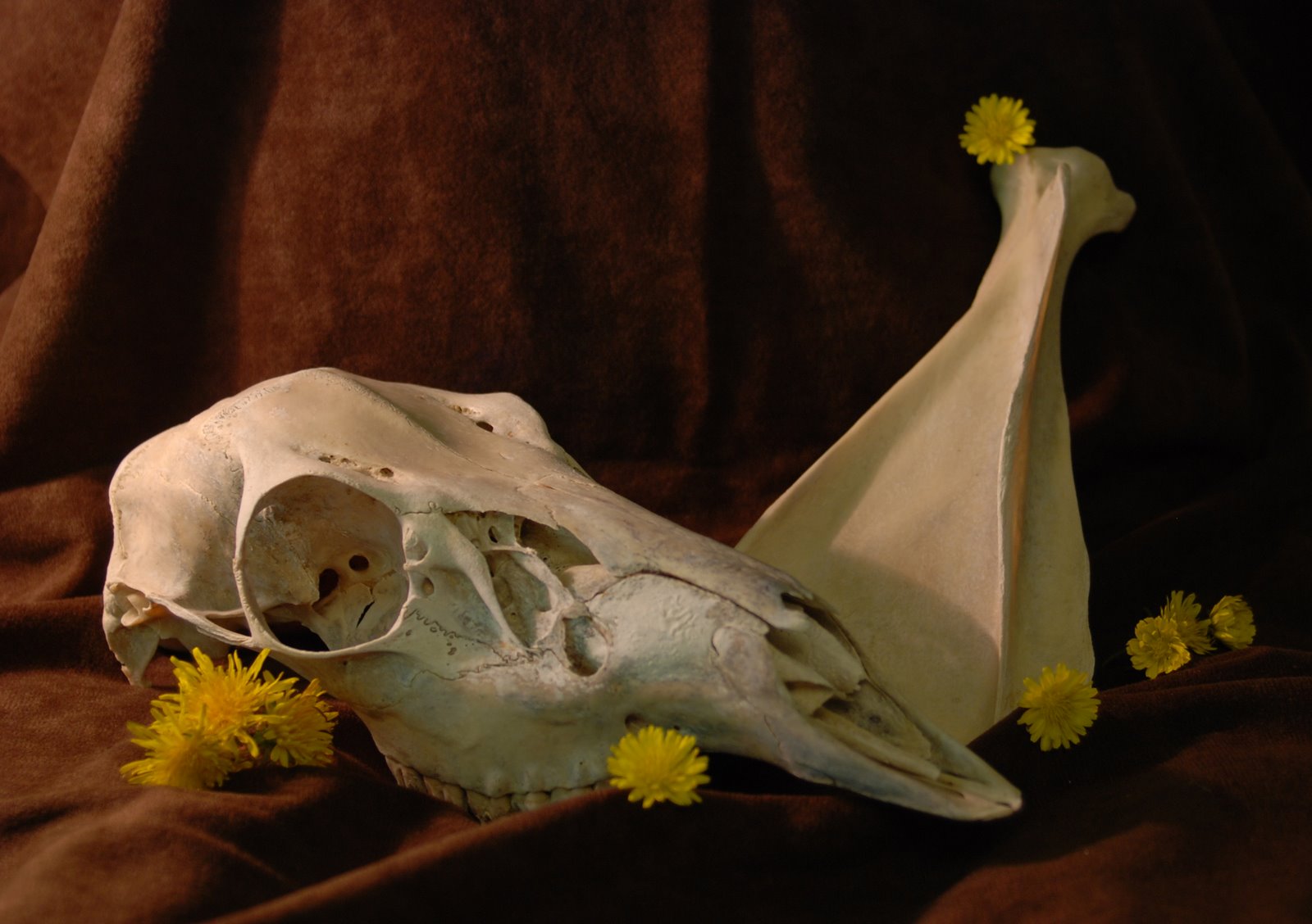 This is a themed still life on the theme of mortality. The deer shoulder bone and skull show the end result of death which the flowers will soon experience. The delicacy of the yellow flowers also shows the precarious balance that all of life is in. The background is dark brown fake suede. The brown color places the bones and flowers in a more natural, woodsy setting. The material, fake suede, harkens to the feeling and texture of real deerskin. |