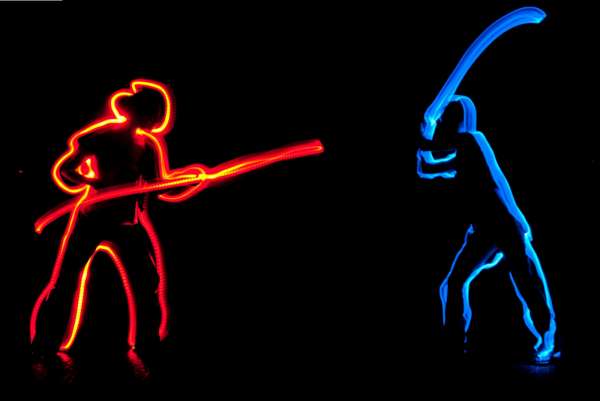 This photo is meant to represent a struggle between good and evil. I chose good and evil because the only lights I had were red and blue and they seemed like the archetypal good and evil colors. This shot is basically a double exposure of my friend Yi with me outlining her in a fighting position with a light and drawing a weapon. |