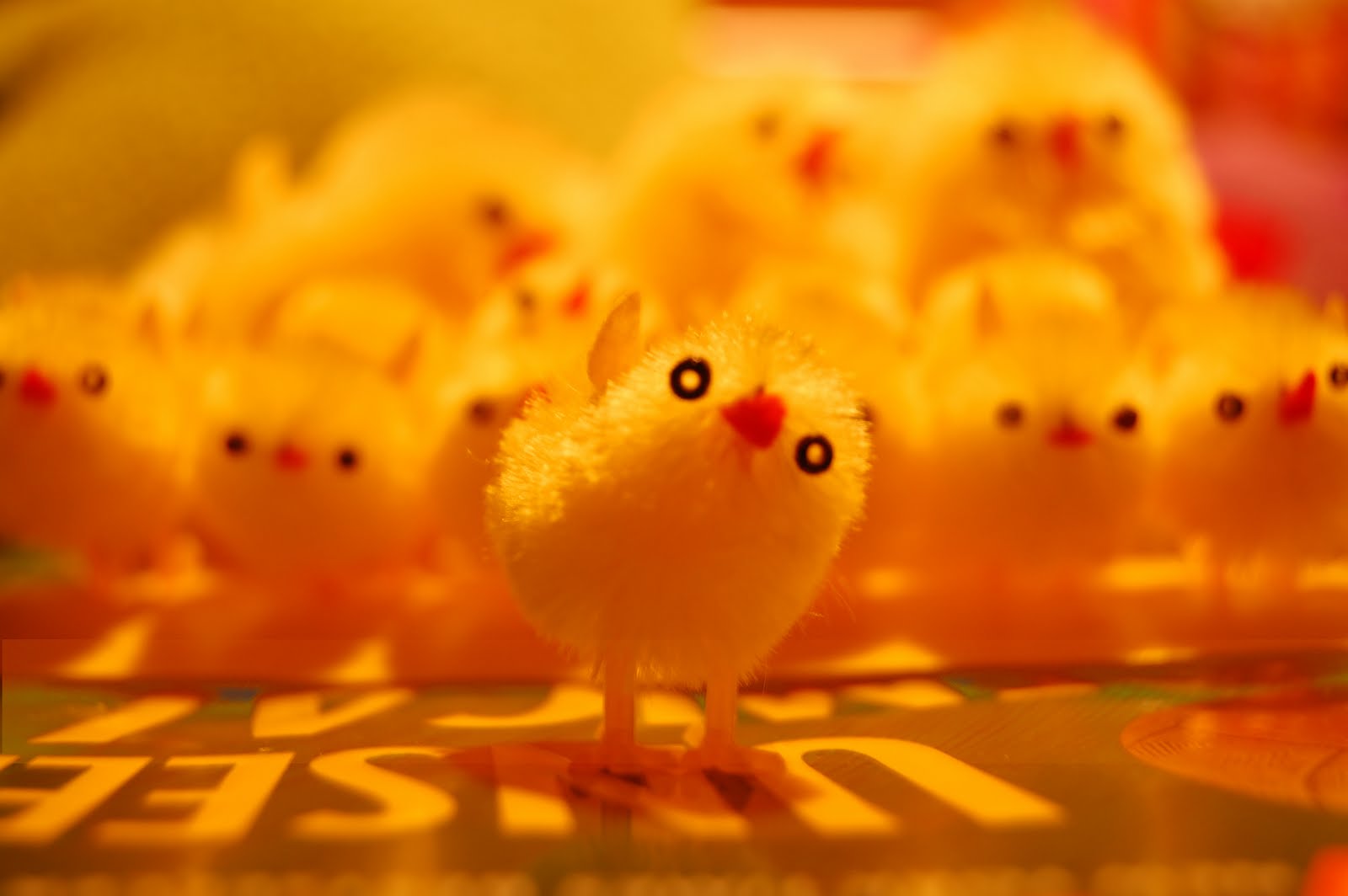 This photo fulfills requirement 4. In easter spirit :) this scene is a back-lit arrangement of easter chicks on a dark green book. I used the the "Shade" setting for white balance for this scene, even though it was brightly lit, to give a yellow tone to the image. This is most apparent in the green book, originally a dark green (rgb 50 50 30) to a light yellow green (rbg 130 70 0). The shadows on the front of the chicks also lost their grayish tone and became a warm orange. Overall, the change in white balance gives the photo a warm, cohesive feel - more like the chicks are a community than the original image, which highlighted the individuality of the subject. | ||
