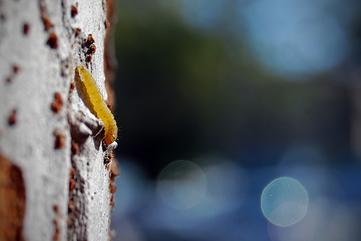 -Requirement 2: Focus on the midground & Requirement 3: Bugs- This is a picture of a small inchworm I found outside my dorm. I focused on the worm's head so that the closer parts of the tree and background fall out of focus, emphasizing the vertical world the inchworm lives in on the tree. The heavily out of focus bright reflections from cars in the background create interesting effects in the blurry world beyond the worm. I was shooting outside in bright light, so I set the camera to ISO200 so that I could use a fairly large aperture along with a long focal length to achieve shallow depth of field. I chose not to avoid the strange lens flare effect, since I thought it fit ok with the composition. Sharped the image a little bit in Photoshop and boosted the contrast. | ||