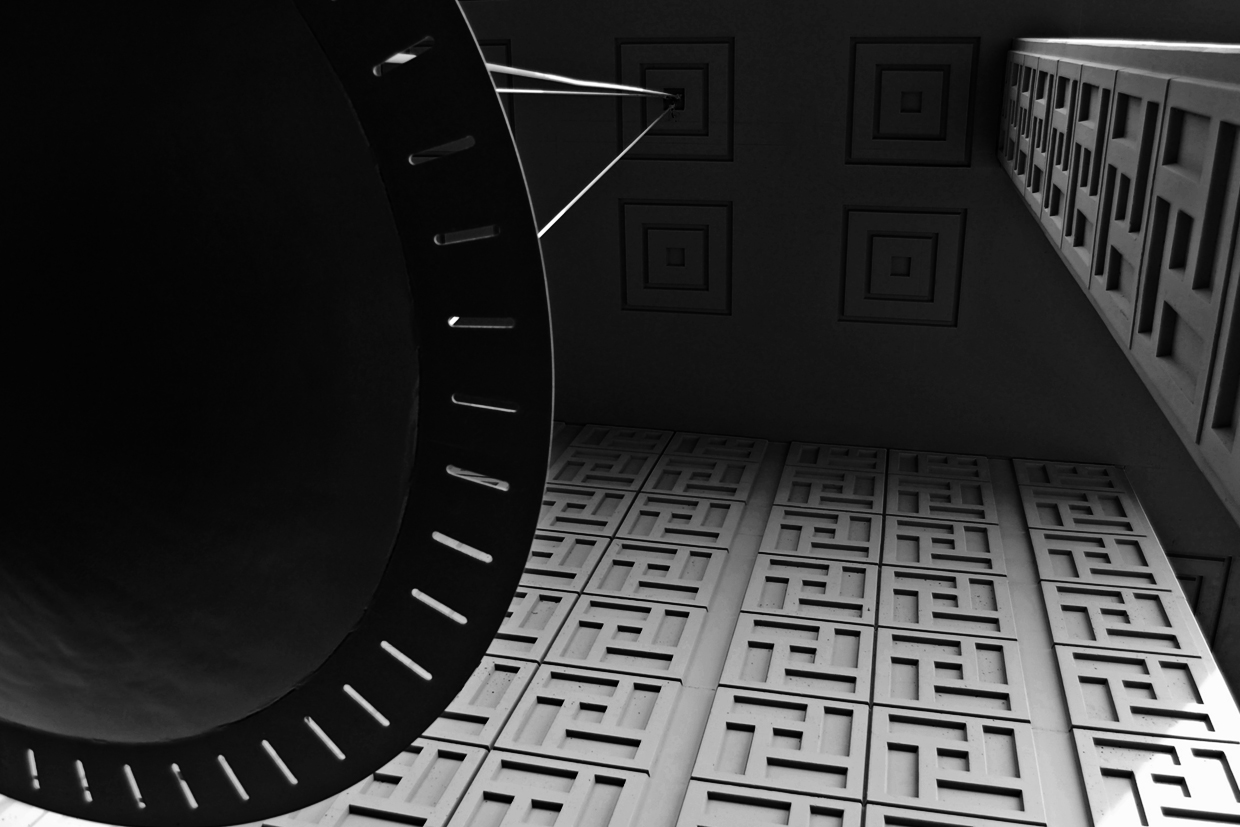 -Requirement 1: Vertical vanishing point & Requirement 4: Repeating patterns- Part one of a two-part series focusing on the rather obvious and strange patterns at the Stanford Medical Center. This one uses a strong vertical vanishing point tracing the pillar and wires holding the strange object on the left. Middle of the day so used ISO200. When I took this picture I wanted the orb on the left out of focus slightly so that the focus of the picture was the patterns on the wall, so I opened the aperture wide to f5 and let metering take care of the shutter speed. After looking at the picture, I wish I had used a smaller aperture so that the entire shot was in focus. In this and the next picture I wanted to simply focus on the surreal bits of architecture around the med building by creating compositions featuring only small portions of the building out of context of the larger structure. I decided the muted orange color of the building detracted from the sharp lines of the patterns in the wall, so I converted the image to black and white in Photoshop and boosted the contrast. | ||
