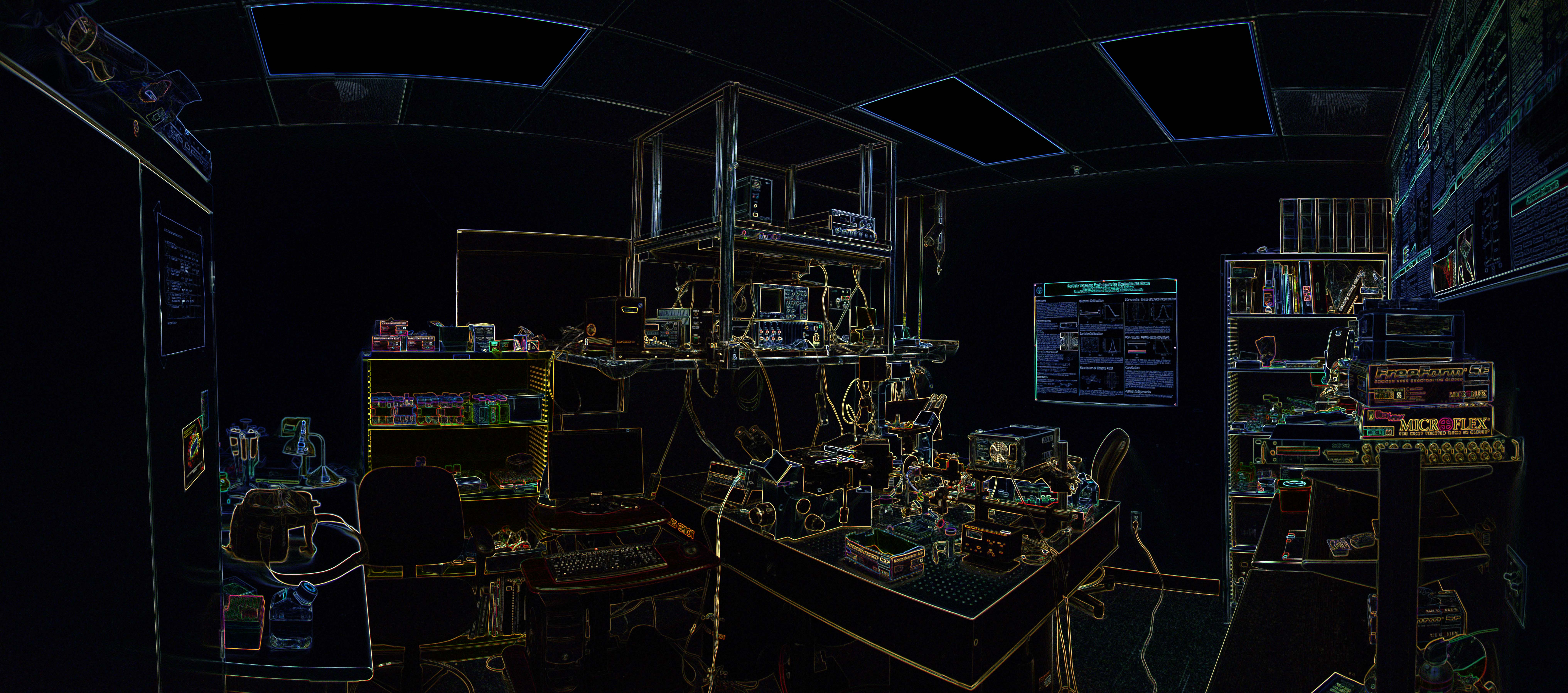 This image satisfies requirement #5 (interior panorama) This is an indoor panorama of our lab composed of 10 images. It's a pretty small room, so the distortion is particularly noticeable and this is part of the reason I chose this space. I set my camera to ISO400 for the indoor shot. In order to keep the exposure as high as possible I opened the aperture as wide as possible at the 18mm focal length (F3.5). The exposure was 1/80s. I inverted the colors using the "glowing edges" filter under filters>stylize. I liked the effect because it highlights all of the colorful details in the room. These include the name on the gloves box at the right ("microflex"), the outline of the optical table and microscope. All the wire and tubing outlines in the room. My favorite part are the colorful test-tubes in the shleves at the middle left of the image. | ||