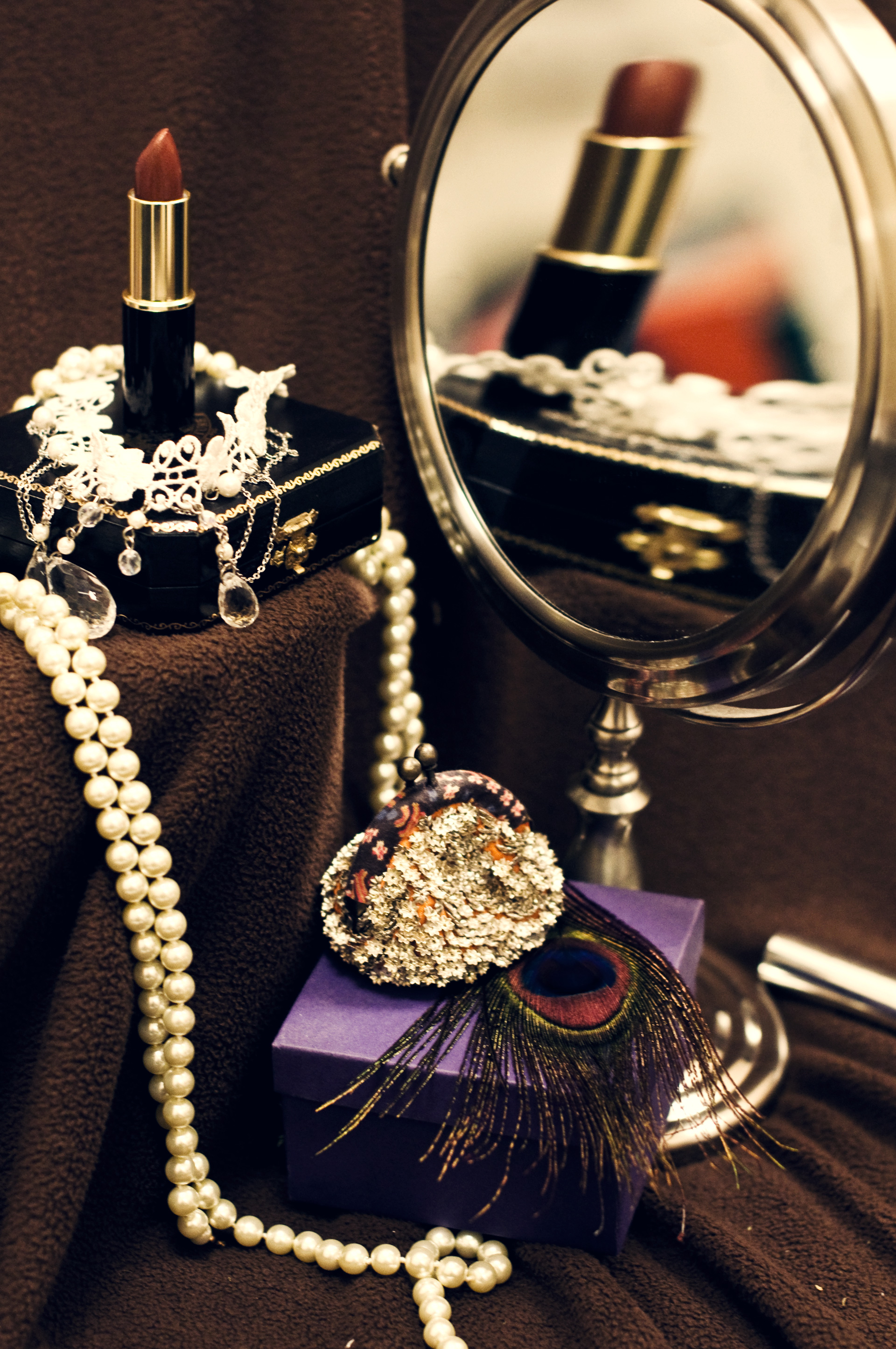 For this photo, I was inspired by Charles Gilbert's All Is Vanity. I really wanted to make a scene portraying vanity with a hidden skull. Even though the skull is not as evident in my photo as in his drawing, you can still see it if you look the right way. The necklace around the lipstick and its reflection are the two eyes, the coin purse is the nose hole, and the pearls and mirror frame hint at the outline of the skull. My skull is inverted in since the holes are white and the skull part is dark brown. With just the skull outline I thought the image was a bit boring, so I added a peacock feather (symbol of pride) and lipstick to represent vanity further. Setting up a still life collection is a lot more work than I thought! I am still not fully satisfied with my setup, but I do not have the type of resources/props to make it perfect. For the background I used a brown blanket so that the white colors would stand out. I also put a little box under the blanket so that I could set the jewelry box on top of it. I also wish I had thought to hold another dark piece of fabric behind me so that the mirror reflection would look more in place. For the lighting, I do not really have lights besides my ceiling light so I moved the setup so that everything would be lit the way I wanted. I wanted the top right edge of the mirror frame to be lit so that it would look more like an edge of the skull. To process this, I played with the curves to make it more contrasty. After doing this, the whites were too white, so I added a blue exclusion layer to make them more ivory/creme colored. I shot with a f/2.8 aperture to get everything but the background pearls in focus. I focused on the box clasp because I set it up so that everything I wanted to be in focus would be close to that plane. | ||