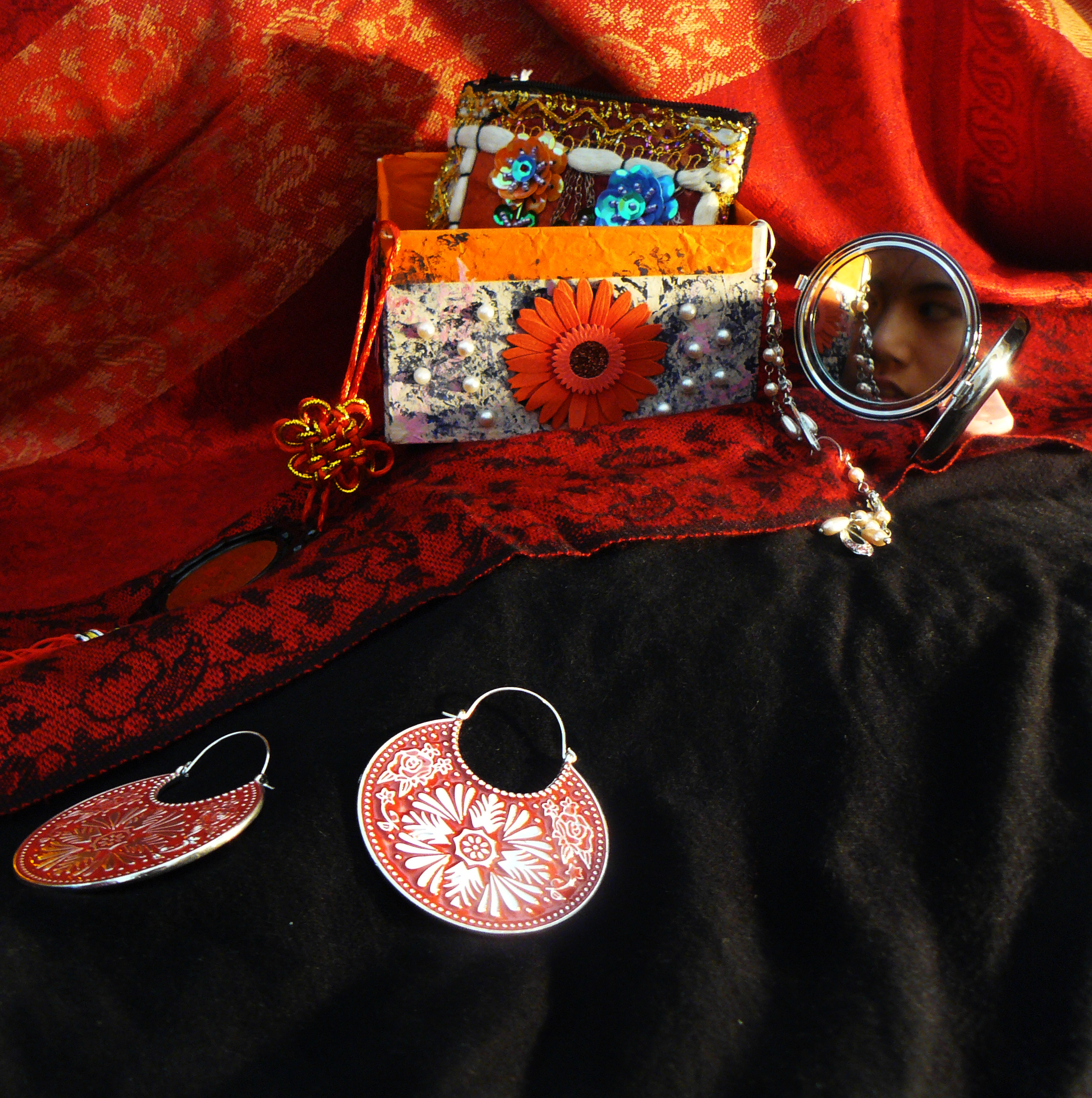 Requirement 1: Background The theme for this collection is vanity. The items collected here are a jewelry box with pearls, a pendant, 2 pairs of earings, a compact mirror and an embroidered purse (in the box). Items typically associate with feminine vanity. After the lecture I was interested in incorporating diagonal lines and playing with color. I chose a silk scarf as the background because it was also related to the theme and especially because I liked the added complexity the designs on the scarf added to the scene. I knew I wanted a color scheme of red and black but I switched from a black persian rug to this plain black background because I wanted to contrast the excess of details of the top with something plain and simple at the bottom. Using a bottom with its own design just made the photo too over-cluttered with detail. The first few photos I took were too boring and flat because the background was rather 2-dimensional, so I raised the center of the scene with a book and added some ripples to the red scarf. I found that this gave it an interesting shadow when illuminated from the side. I also wanted the top lighting to be warmer and more yellow than the bottom and so I got a yellow table lamp and angled it upwards while leaving the bottom illuminated by my normal white light. After that, I realized that the photo was too imbalanced, with too much color and detail on top, so I added a large pair of red earrings with an intricate design to counter-balance the scene. The reflection of the mirror was troublesome, and I got an idea to get a female friend to pose so that her face could be seen as a reflection in the mirror, further fitting the theme of vanity. I took a few more shots but realize that her face was too dark so I got another lamp to illuminate her face. I had to use a pretty large aperture (3.6) because there wasn't enough light, however, I needed enough depth of field to get everything in focus and hence I couldn't go down any further, in the end, I needed an exposure time of 1/3s and it took a few tries before I could get a nice stable shot of the setup. The large earrings were slightly overexposed and were slightly darkened in photoshop. I chose this photo to submit also because I particularly liked the expression on my friend's face in the mirror and the little detail of being able to see the reflection of the pearl earrings hanging on the box in the mirror as well. I also liked the texture of the scarf as a background and the juxtaposition with the plain featureless black bottom half. | ||