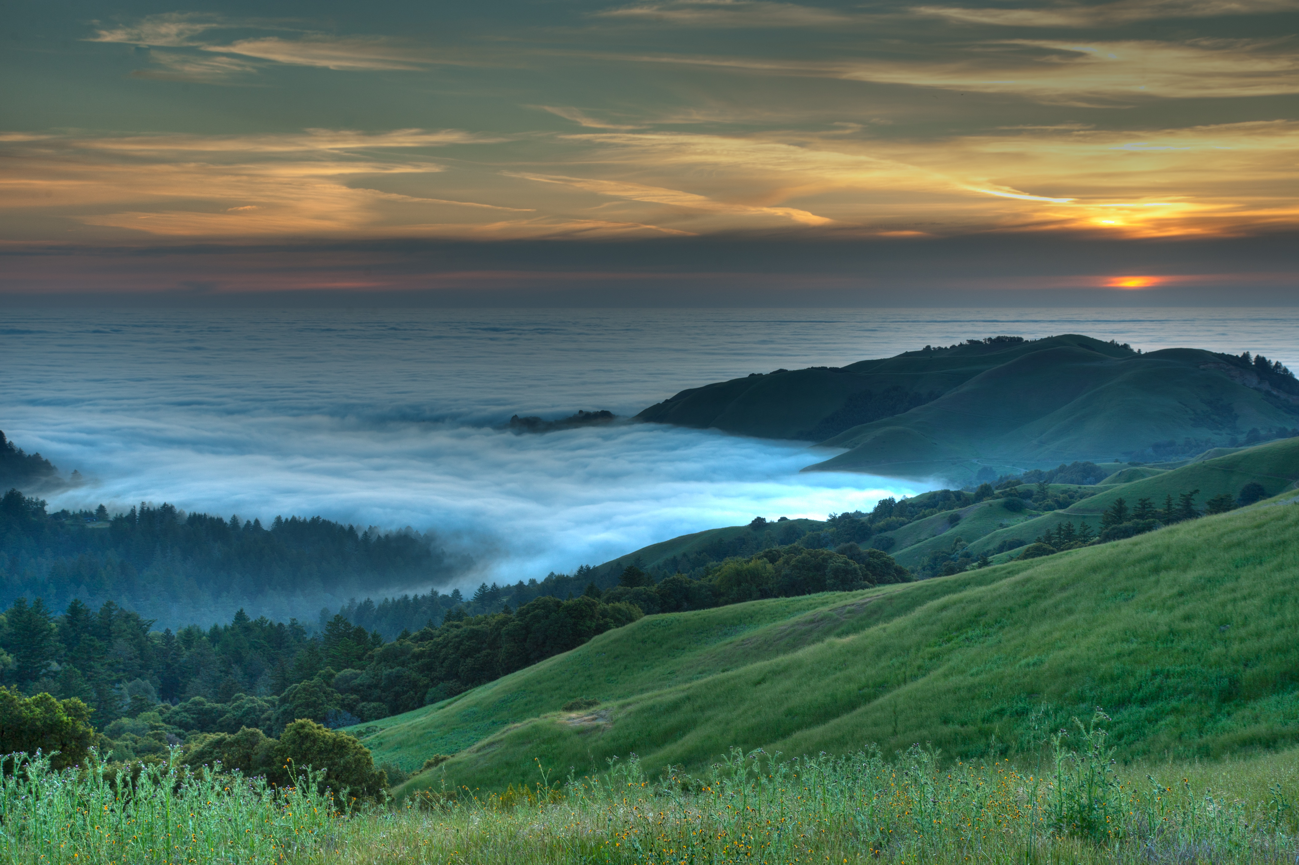 Req. 2: Improve on nature. This was taken at russian ridge at around 8 pm just at sunset. As it was getting pretty dark, i used a tripod with an exposure of 1/15 sec at ISO 100. I also took two more shots at +-1 stop and merged them in photomatix. Also straightened the horizon and removed the sensor dust in top left corner. Compare with original at http://picasaweb.google.com/amardeeps/CS178Assignment6LandscapeAndNature#5472128778957379570 I love the way it turned out. The scene was breathtaking and the clouds made it look like floating in sky. This also fulfills requirement 5 - The golden hour. | ||