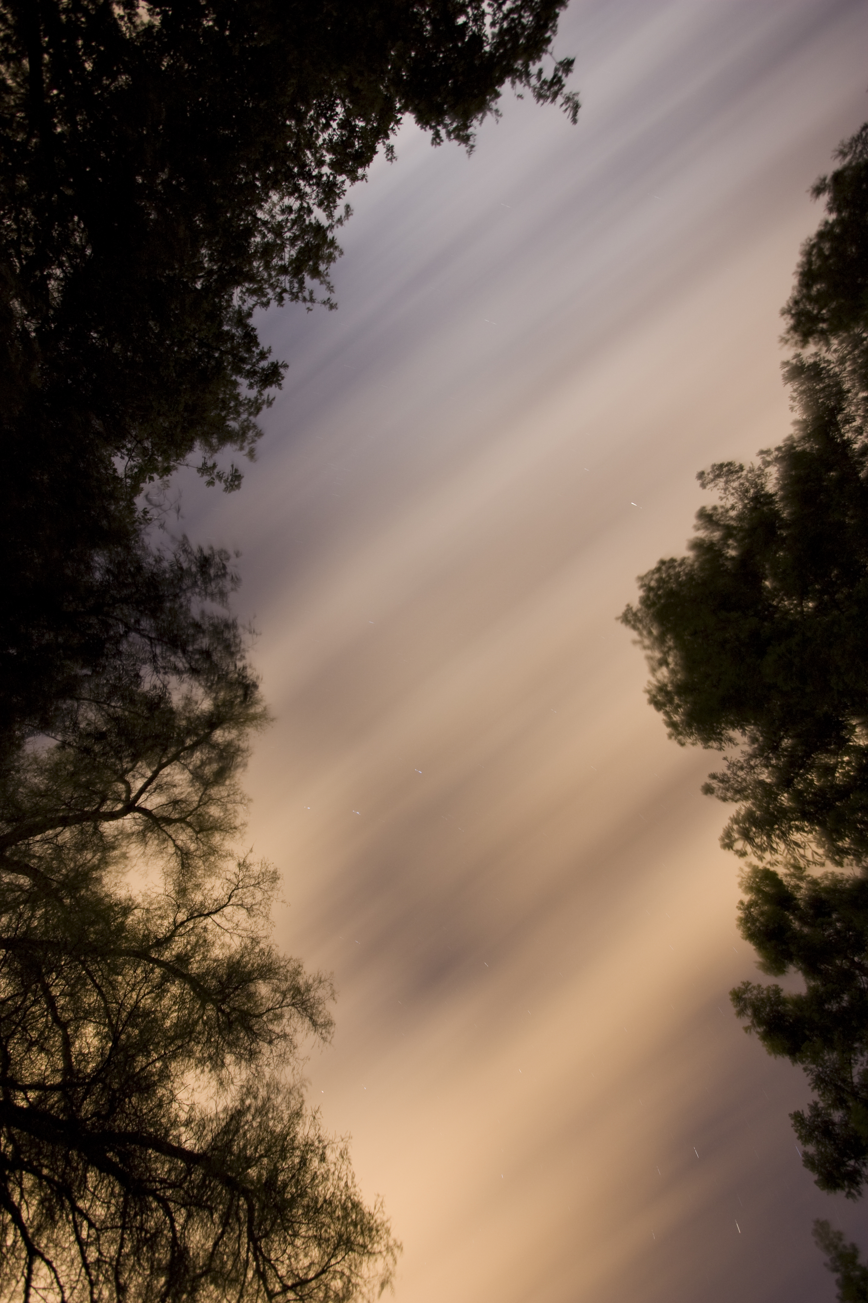 I took this picture in the small park after the Hanna House on the way to the Dish from Stanford. I was looking for a place with trees and no artificial light. I wanted to capture the motion of the stars through the branches but when I arrived there many clouds were covering the sky. At first I wanted to set a 8 min exposure but with the clouds I limited it to 4min. To estimate the correct aperture with ISO 100, I first boosted the ISO up to 1600 and used the widest aperture available on my wide angle. Then I did the math so the picture would be well exposed at ISO 100 with an exposure of 4min. To be sure that no parasite lights (from cars passing) went through the lens, I oriented the camera up to the sky. In the end I like the result. I was lucky, the clouds were moving along the diagonal of the frame that adds dynamism to the composition. The reddish hue comes from the light of Stanford and contrasts well with the cold blue of the top. No post processing were made. This picture meets requirement #1. | ||