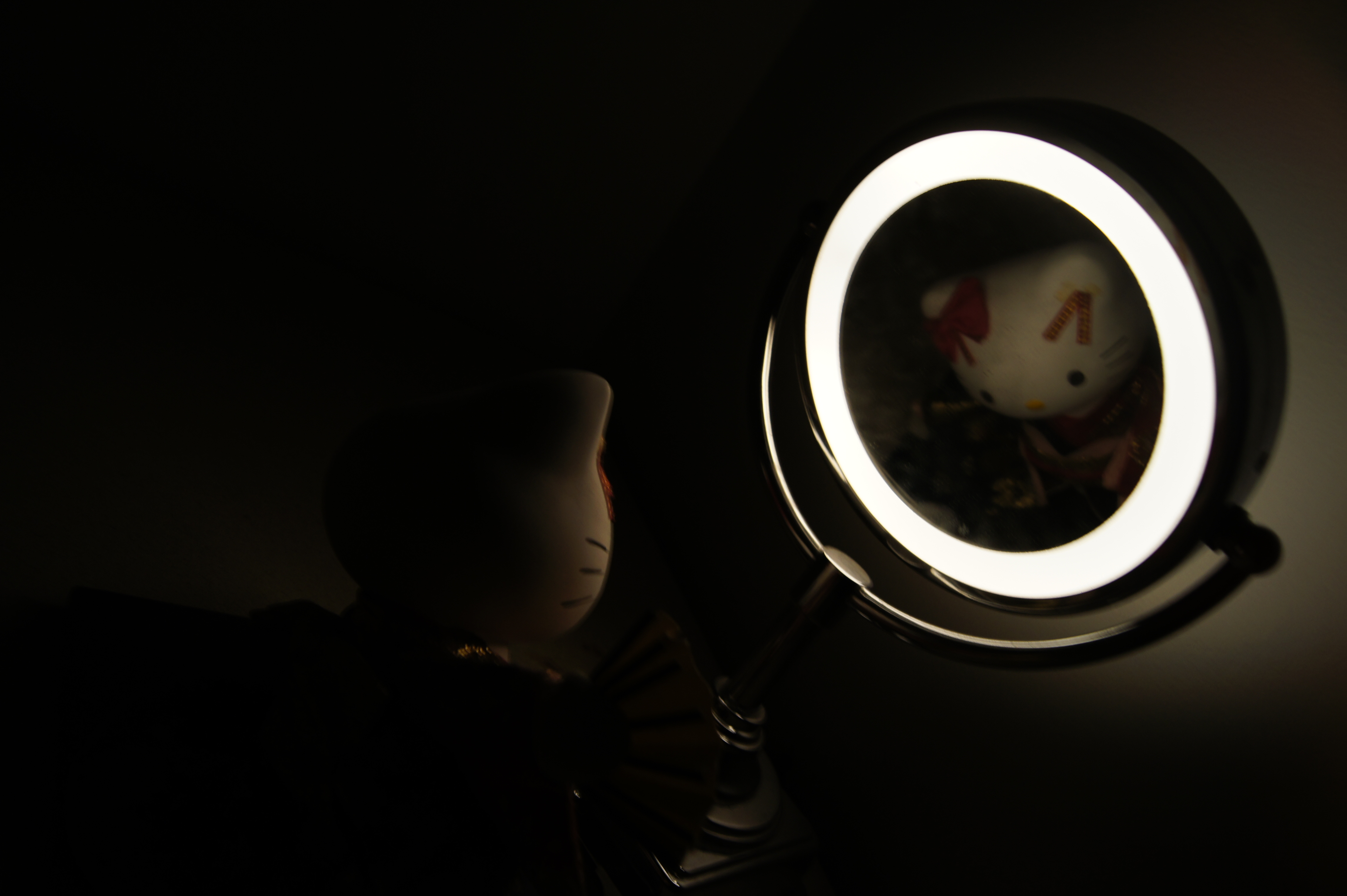 Set in a pitch black room, the only light geisha Hello Kitty can gaze at her reflection through is that of the vanity mirror. The black leads to the unknown surrounding her, even the fact that she is not facing the camera directly creates this foreboding, eerie feel. It seems as if there is more to her than appears. To create this eerie, almost sad feeling of geisha Hello Kitty, I underexposed the image. The room was pitch black, and I left the exposure low (1/5 second). The light from the vanity mirror was the only light in the entire room. To create this angled image, I shot from the upper right of the statue, and I made sure to angle the mirror so that from the angle of the shot you would be able to clearly see her face and what the statue is. Part of the reasoning behind the mirror and the underexposure, is that because it is so dark you can only see the outline of what the statue is, but you cannot tell it is Hello Kitty dressed in an elaborate costume. That is the purpose of the mirror, both to shed some light on the statue but also to show the audience what it is they cannot see in the dark. This creates the eerie, feeling. You can't see the dark figure, except for a face in the mirror. Is there something more to this statue? A deeper emotional conflict? Who knows... | ||