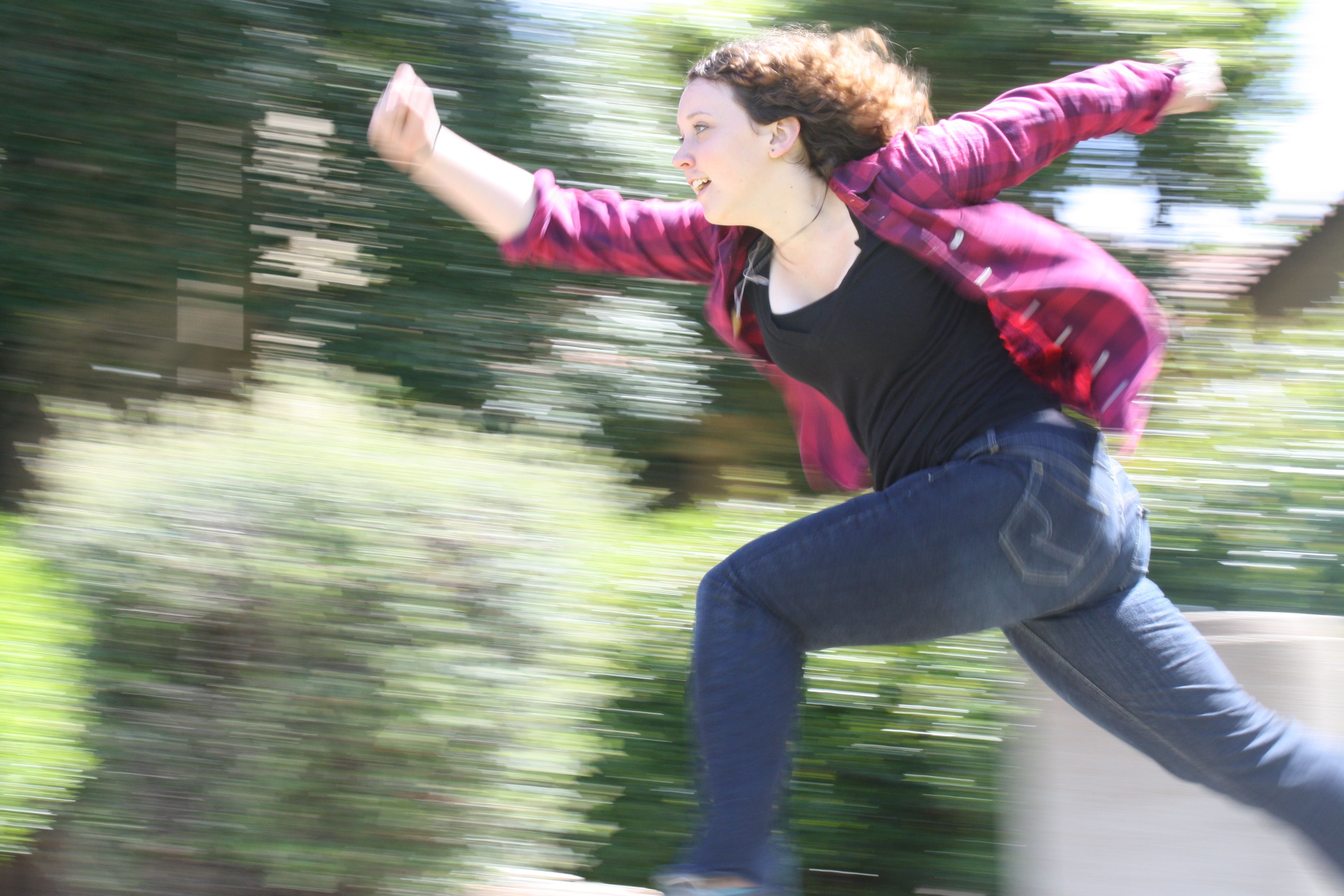 This photo captures the subject in motion while the background is blurred. Here a slow shutter speed was used while I ran alongside the subject so that the same camera and the person was moving at the same speed. | ||