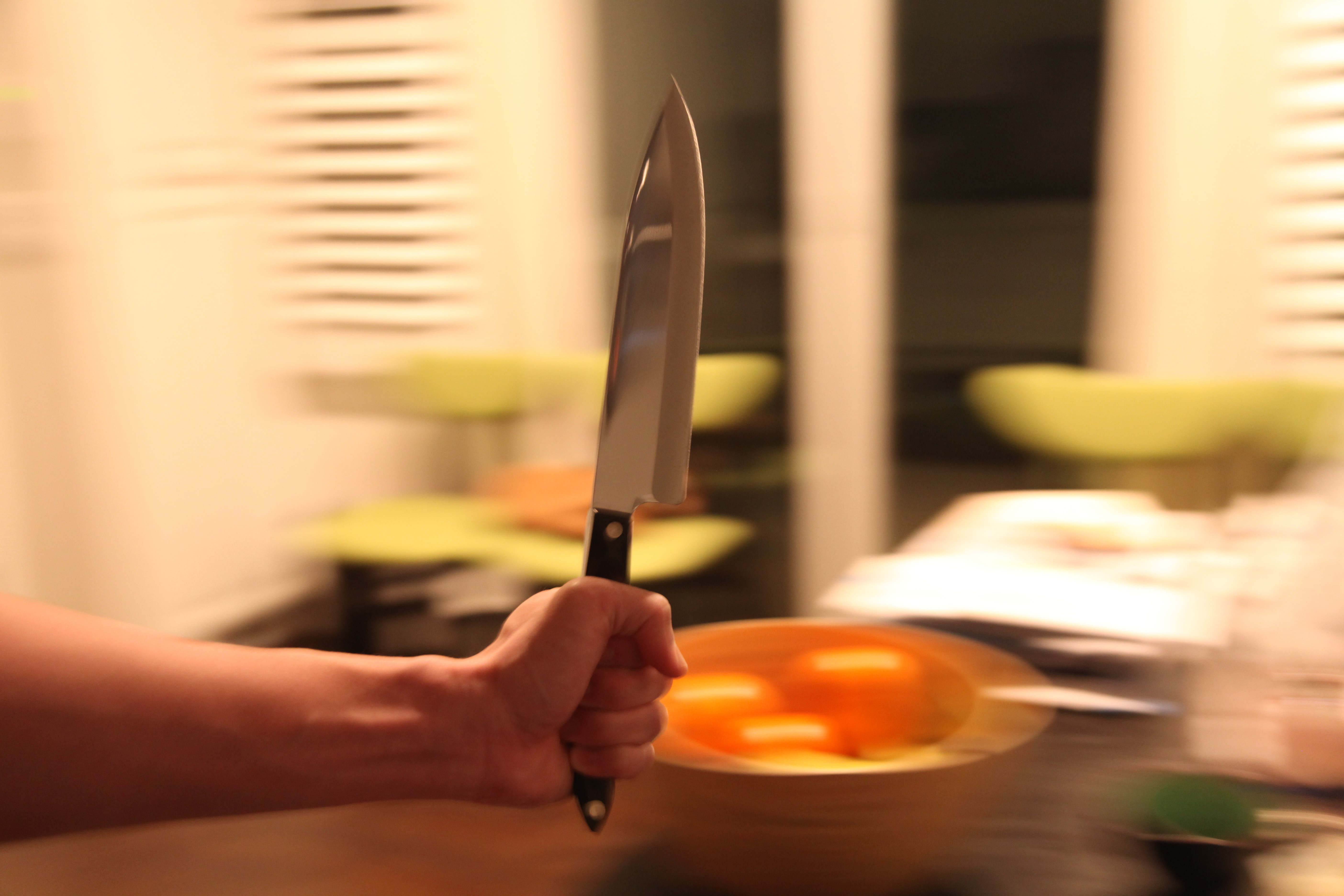 This is my favorite shot of the series. I like the how sharp the sharp knife is in contrast to the blurred background. I followed the knife very closely, it only took one try to get it right, surprisingly!! I used the 5D Mark II for this one, this camera is amazing! Given the poor lighting conditions, the image still turned out very sharp. | ||