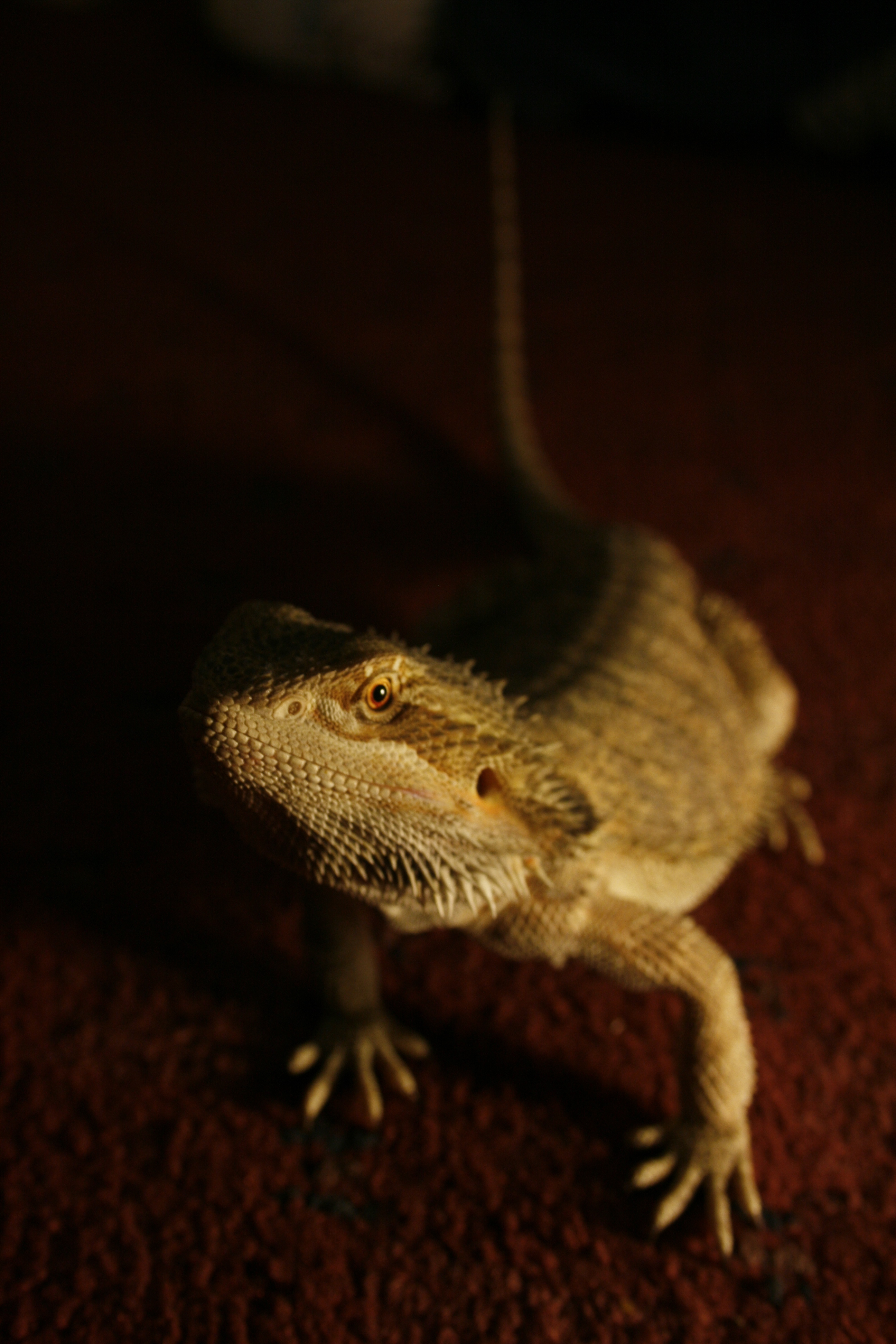 This is EO, my drawmate's baby bearded dragon. I took him out for a little photo shoot against the dark red carpet and with some angled lighting. | ||