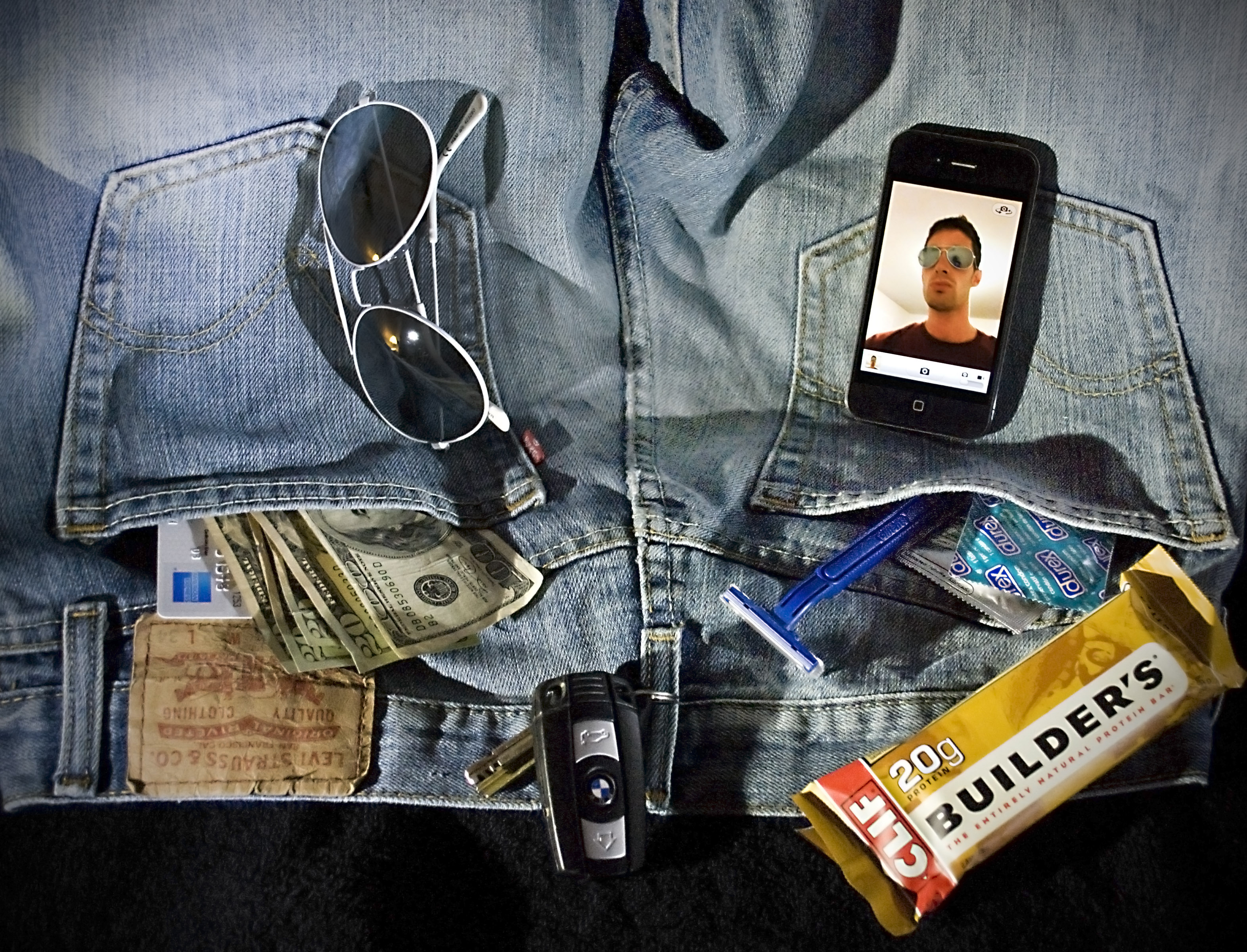 This photo is a Themed Collection with the theme of "Vanity". I took the traditional symbols of vanity--mirror, comb, jewels, coins, purse--and replaced them with what I thought of as masculine, 21st-century equivalents--iPhone in front-facing camera mode, razor, sunglasses, cash, luxury car keys, and more. To an extent I tried to make the classic "skull" appear, by having the sunglasses and phone be the eye holes (rather self-referentially), and the keys be the nose hole. I had to do a lot of burning and dodging of shadows to get this effect, and it still is incomplete. Besides the skull, I arranged the rest of the elements to achieve color balance--the tan of the protein bar and jeans logo patch across from each other, the blue of the razor and the American Express logo, etc. Background: I used Levi's jeans as the background since denim is often seen as a sexualized, yet masculine fabric, fitting with the theme. This conveniently allowed me to stick some of the items in pockets, which looked natural and fitting. Lighting: I lit the scene with two spot lights from the front, at angles, so there weren't any completely shadowed areas. I took the photo from above the scene and had to do a handheld shot with high ISO; with multiple shots, one of them came out clear enough to use. I cropped, color-balanced, denoised, burned/dodged, and sharpened the photo in Photoshop. | ||