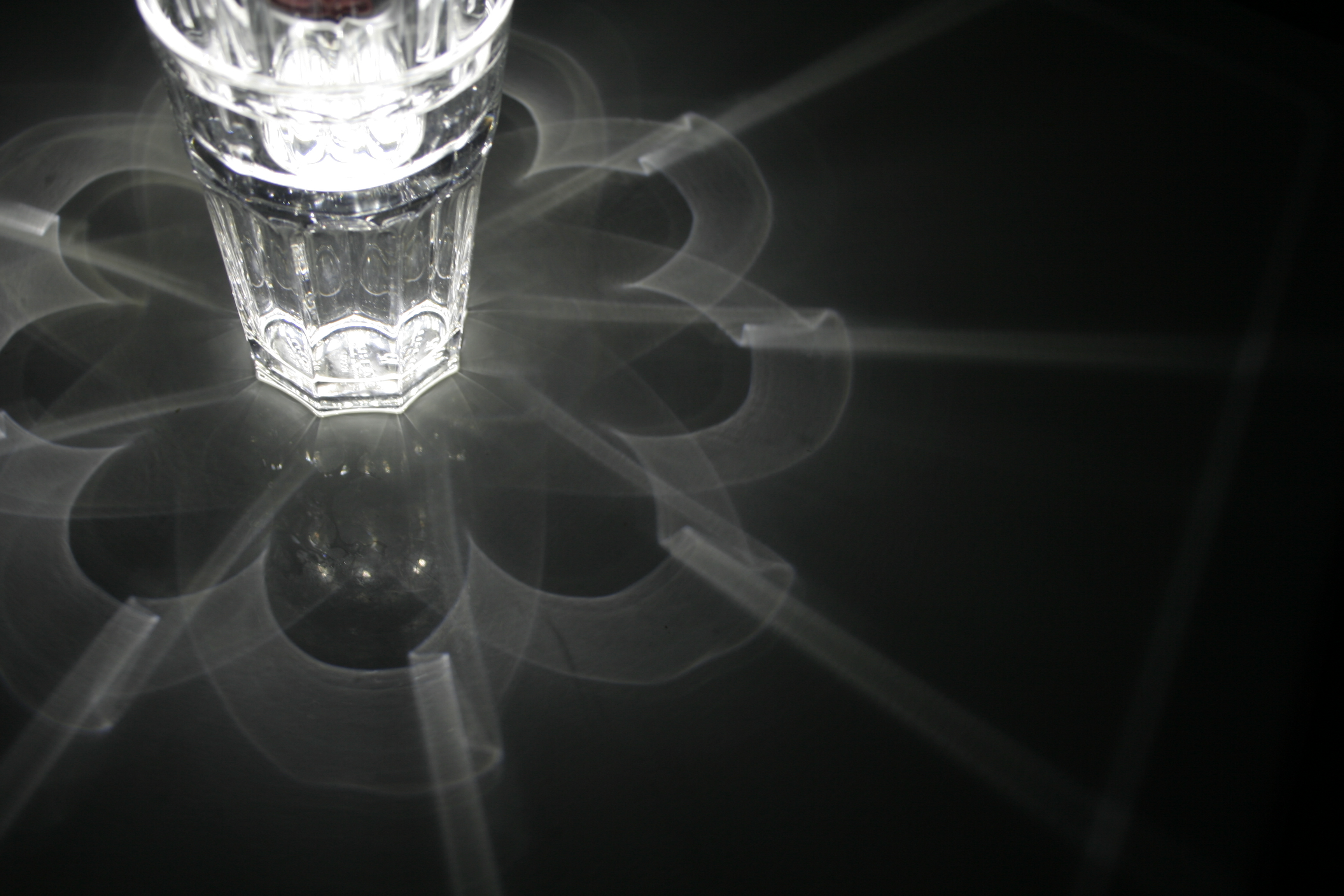 The setting of this photograph took some time to get the right effect. I set two glasses (one fill of water and the other one inside the one with water. The surface, is a glassy white counter of a washing machine. I wanted to get as much reflection as possible. The light Inside the empty glass I put a camping headlamp. This is a bright white light, perfect to the effect I was trying to achieve. To get enough light with the camera I set a long exposure (1/8 sec) and no external light. | ||