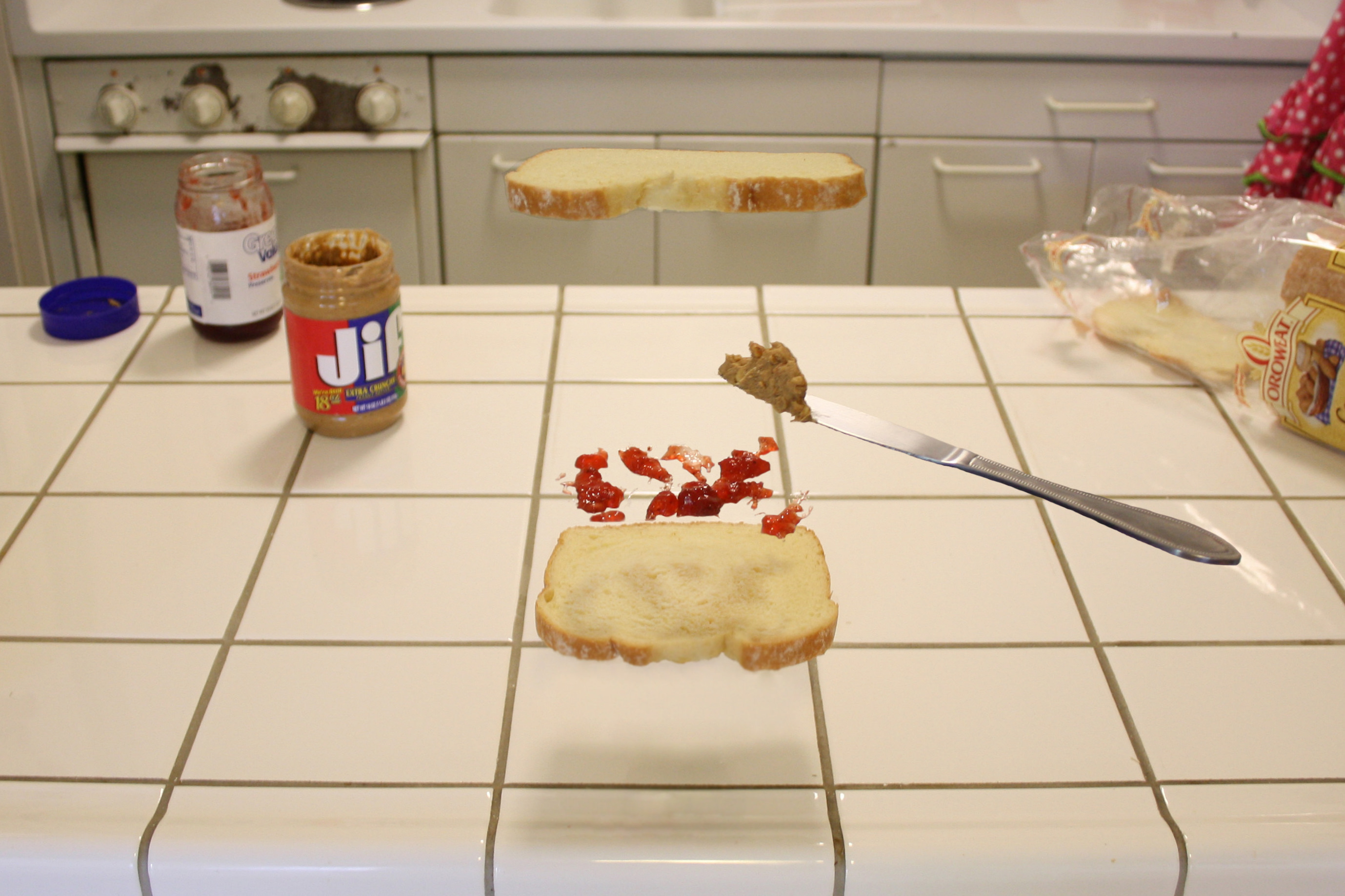 I combined the three photos (previous) in photoshop, with the bread-only layer on the bottom, then the jam/peanut butter layer, then the top bread layer. I then used a layer mask to erase everything except for the top piece of bread in the top layer, and did the same for the middle layer to leave only the jam, knife, and the shadows of the jam on the bottom piece of bread (which was difficult because the two bottom bread pieced were shifted slightly). I then had to remove the pepper shaker from the bottom layer, which I did using a combination of copying and pasting an adjacent tile, using the stamp tool, and finishing it off with the healing brush. Finally I cropped the photo to get rid of a few of the peripheral details and straightened it slightly. Voila! | ||