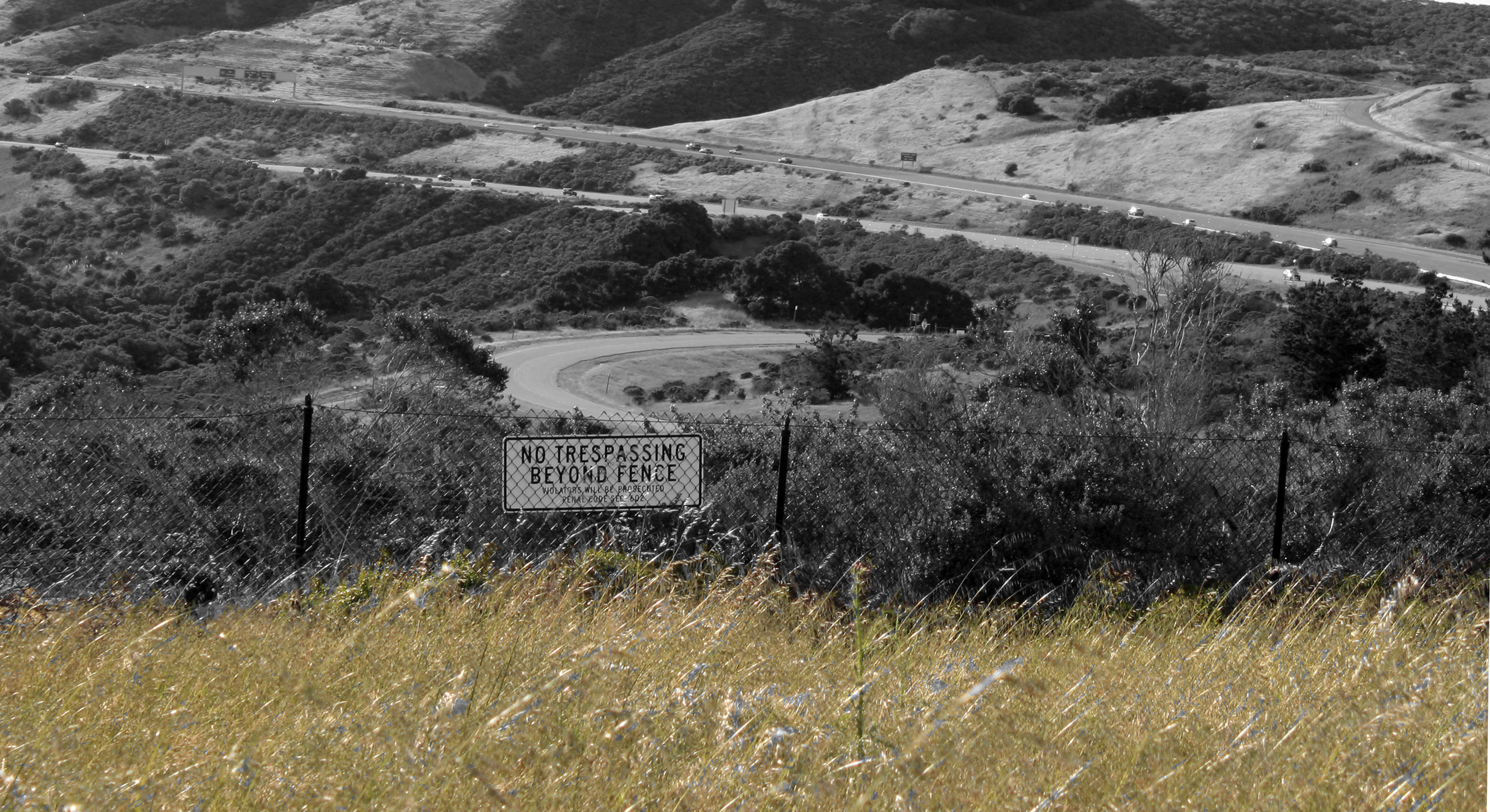 The S curve in the photo is the windy road that one can barely see behind the fence. I took this photo near the 280 highway at one of the vista point stops. I wanted to use the No Trespassing sign somehow, so, I made the scenery beyond it black and white so that it tells the viewer that the area is not reachable. It seems as if whoever is on this side of the sign is blocked from civilization (represented by the highway and the cars on it). | ||
