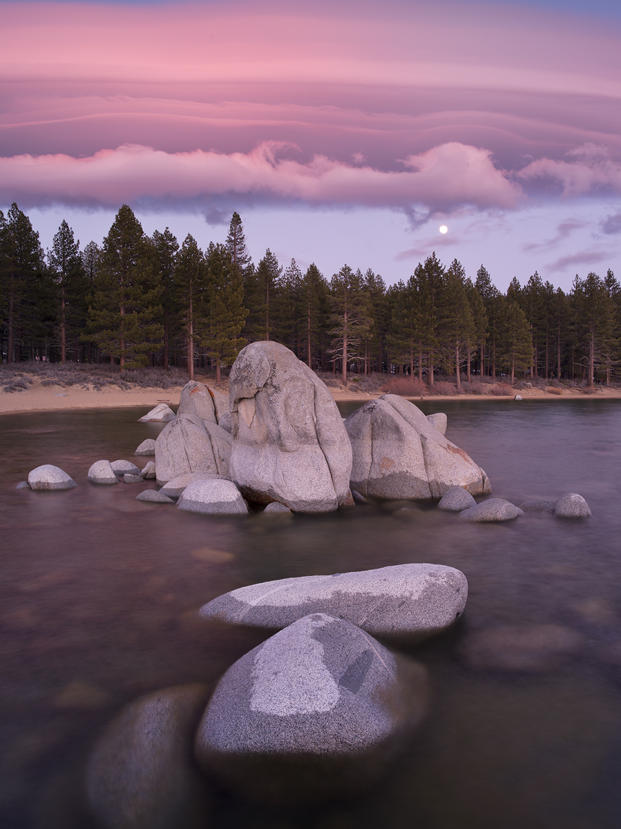 This photo is taken at Zephyr Cove, South Lake Tahoe, California. It was a day before full moon, so the moon was rising shortly before sunset. I lucked out with some lenticular clouds, which are a kind of high-altitude clouds that usually form near mountain ranges and become stable. Interestingly this particular day, the clouds were positioned just over the horizon leaving a clear strip of sky so that the moon can shine through. It was a bit windy, so there were some waves and ripples on the water. Since I couldn't get clean reflections, I used a circular polarizer to remove glares on the front part of the water and to accentuate the part of the rocks under it. The pink-purple golden-hour-glow on the clouds created very smooth and colorful light and the textures of the clouds, rocks and trees were the main theme. I could find a composition that shows both symmetry and simplicity. I used a 35mm wide angle lens on my medium format digital, approximately 28mm on a 35mm full-frame camera, along with a 2-stop soft neutral density graduated filter to get the right exposure. I chose f/13 in aperture priority mode to get enough DOF and avoid diffraction, ISO 100 for maximum image quality. The shutter speed was about 5 secs, which was okay since all the objects were very stable except for the water (which didn't matter since I was not interested in capturing any surface texture). The RAW conversion was done with Adobe Camera Raw, basic curve adjustments were done in Photoshop. Recommende d display settings : temperatur e = 5000K / gamma = 2.2 / luminance = 120 / gray background . | ||