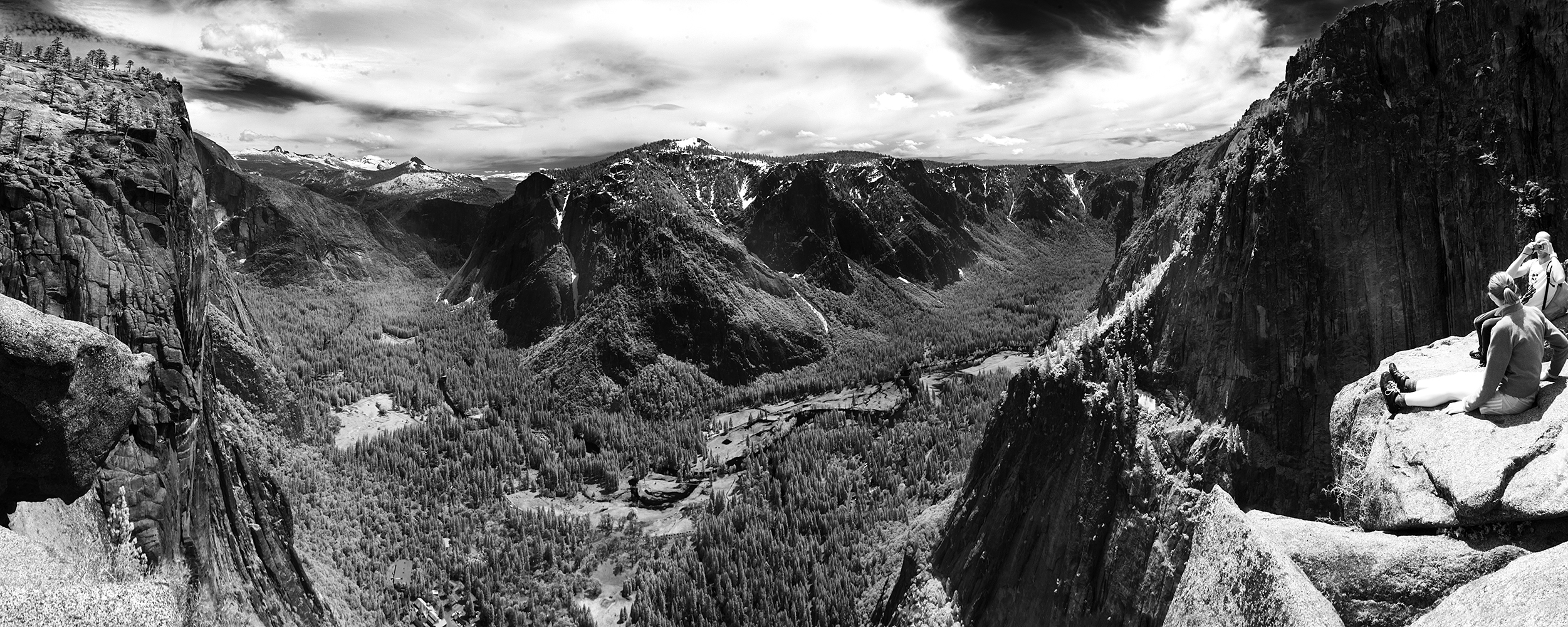 This is an exterior panorama taken from Yosemite point. I shot it in monotone infrared (680nm high cut filter) at F/22 and ISO200 for good depth of field and low noise. (The IR boosts contrast in the sky and forest areas). I did a series of shots from left to right in portrait orientation, using a tripod to minimize motion blur. I stitched the images in photoshop, did a bit of localized contrast (curves) adjustment to darken the sky and lighten the rock wall at the right. Downsized for web, smart sharpened. | ||