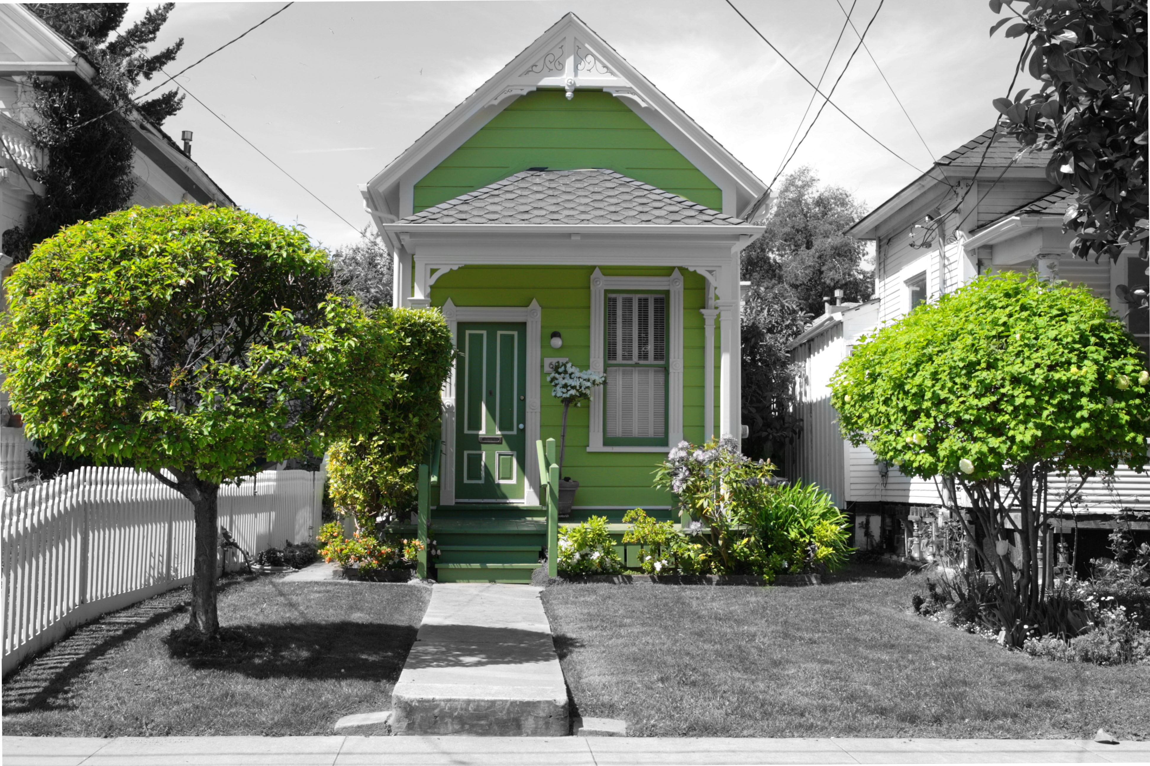When I took this photo, I wanted a large depth of field to keep all of the house's details in focus so I used f/9. Normally, this would mean that I'd need more light elsewhere, but since it was a very clear day, I was able to take the photo with at ISO 100 and shutter speed 1/100. In the original photos, a lot of the photo is green because it's a green house with a lawn and the surrounding flora. To highlight the smallness of the house, I decided to make the green stand out against a black and white background. To do this, I first saturated the colors in Photoshop then created a black and white layer. I then used a layer mask to "delete" the black and white where the green was visible in the original photo. Initially, I only colored the house, but I thought it looked a little lonely so I decided to use the green in the two trees on either side of the house to balance out the photos a little more. In the bush at the bottom right of the house, there were pink flowers but I didn't want them to distract from the green so I left the flower buds in greyscale. | ||