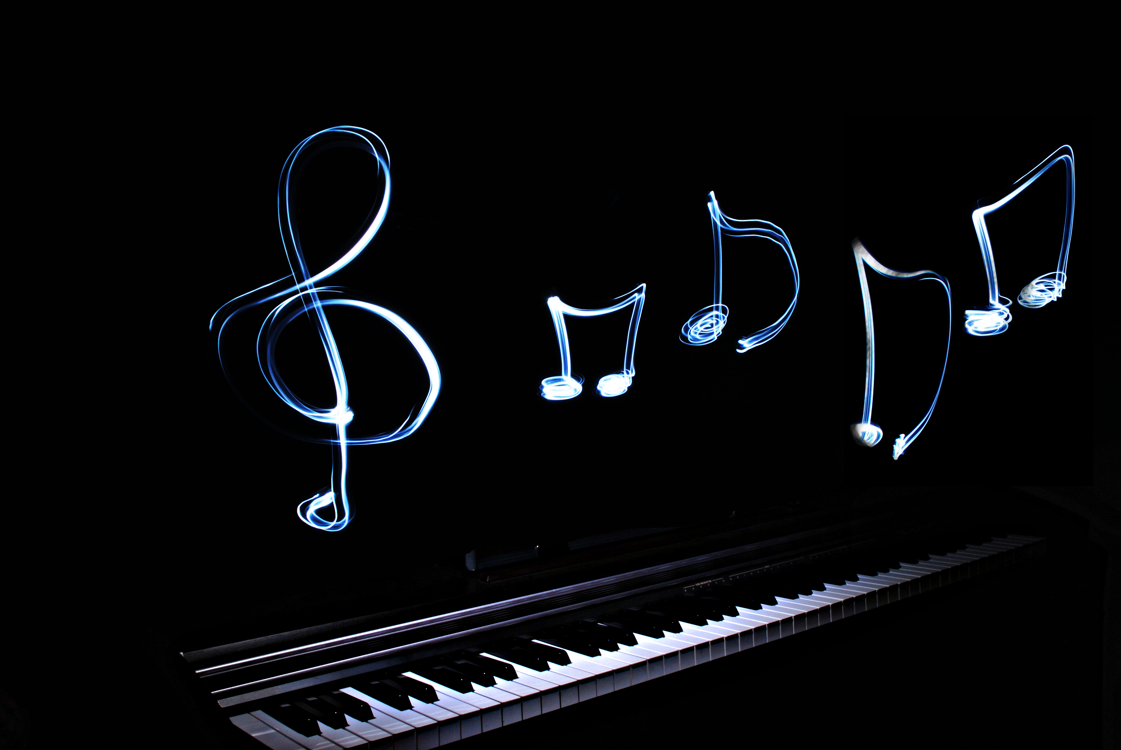 Light source used is an LED flashlight, with which I can turn off the light in between the strokes. I drew these by standing behind the piano; I thought about practicing it and doing this in the horizontally flipped way, but then realized it's easier to do it the usual way, and then flip the photo in photoshop. Since my camera can have a maximum exposure of 30 sec only, this is done with 3 shots and then combined with layers / masks in photoshop. The first photo has the treble clef and the first two sets of notes; the 2nd one last two sets of notes, and the 3rd one with the piano keyboard illuminated. I used the unsharp mask to sharpen the piano keyboard; adjusted the contrast / birghtness for the notes to get the consistent brightness between different pictures. | ||