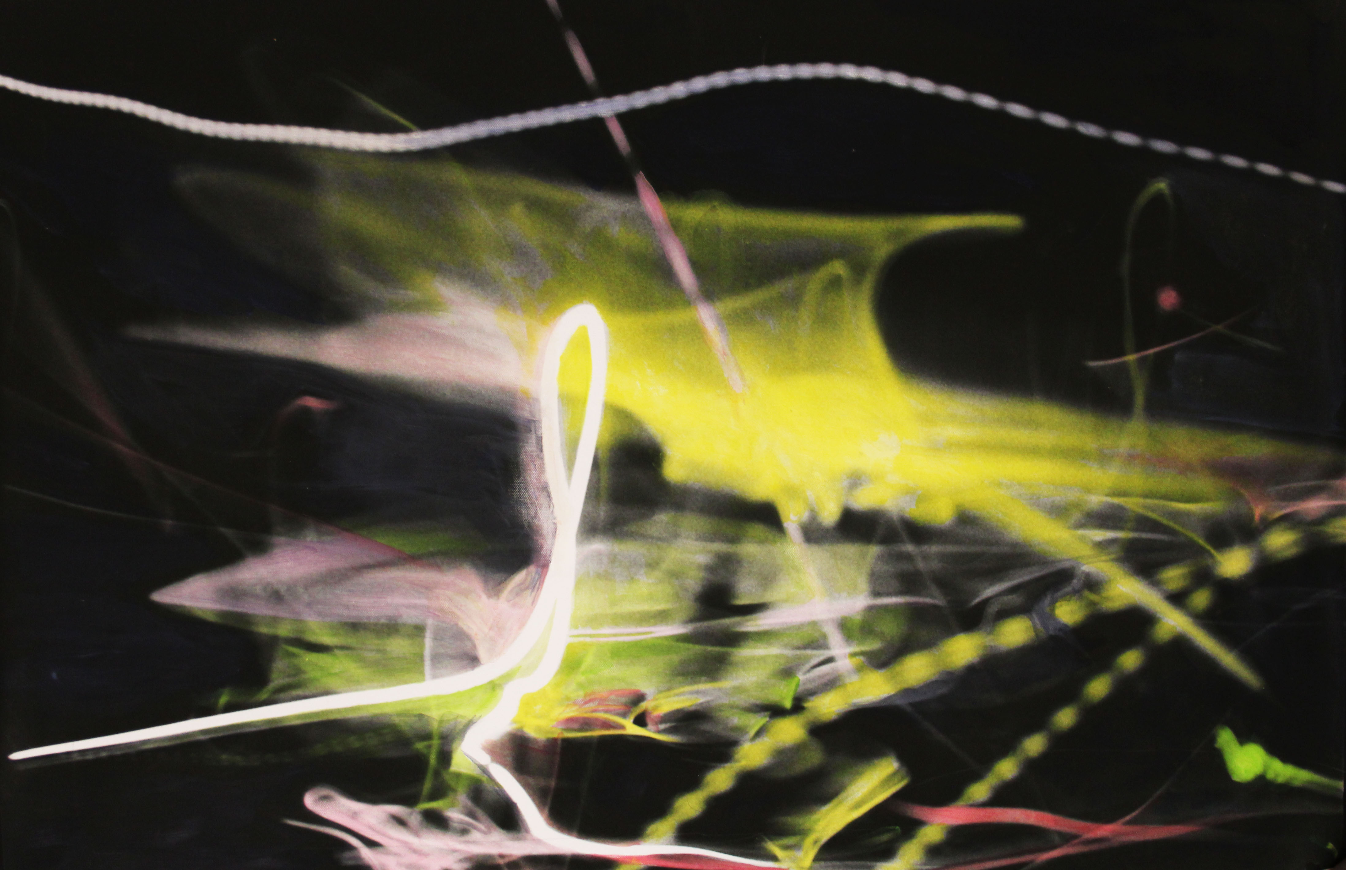 15" @ f1.4 Entirely Blurry: I took my camera to a concert, and as the lights were going crazy, I opened the shutter (bulb mode) and just let it rip at ISO 100. I moved the camera as I moved, and closed after 15 seconds. I found the patterns to be beautiful, but I was shooting on monochrome mode, so I then printed the image on canvas, and then painted (with acrylic paint) onto the image what I remembered the light colors to be. The paint was fairly watered down so not to take away from the original light tracing. I then took a photograph of this canvas. | ||